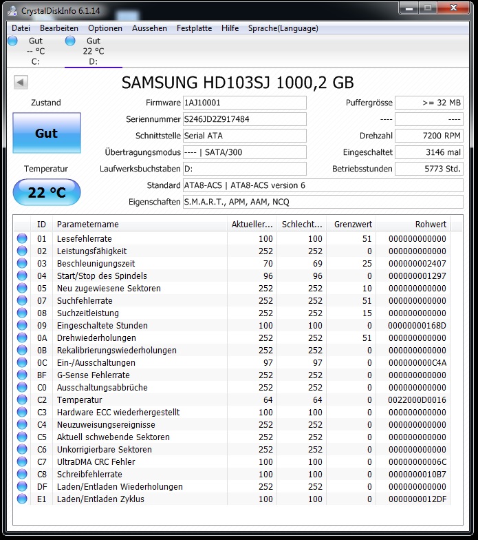 Chrystal Disk Info spuckt aber keine Besorgnis erregenden Informationen aus.