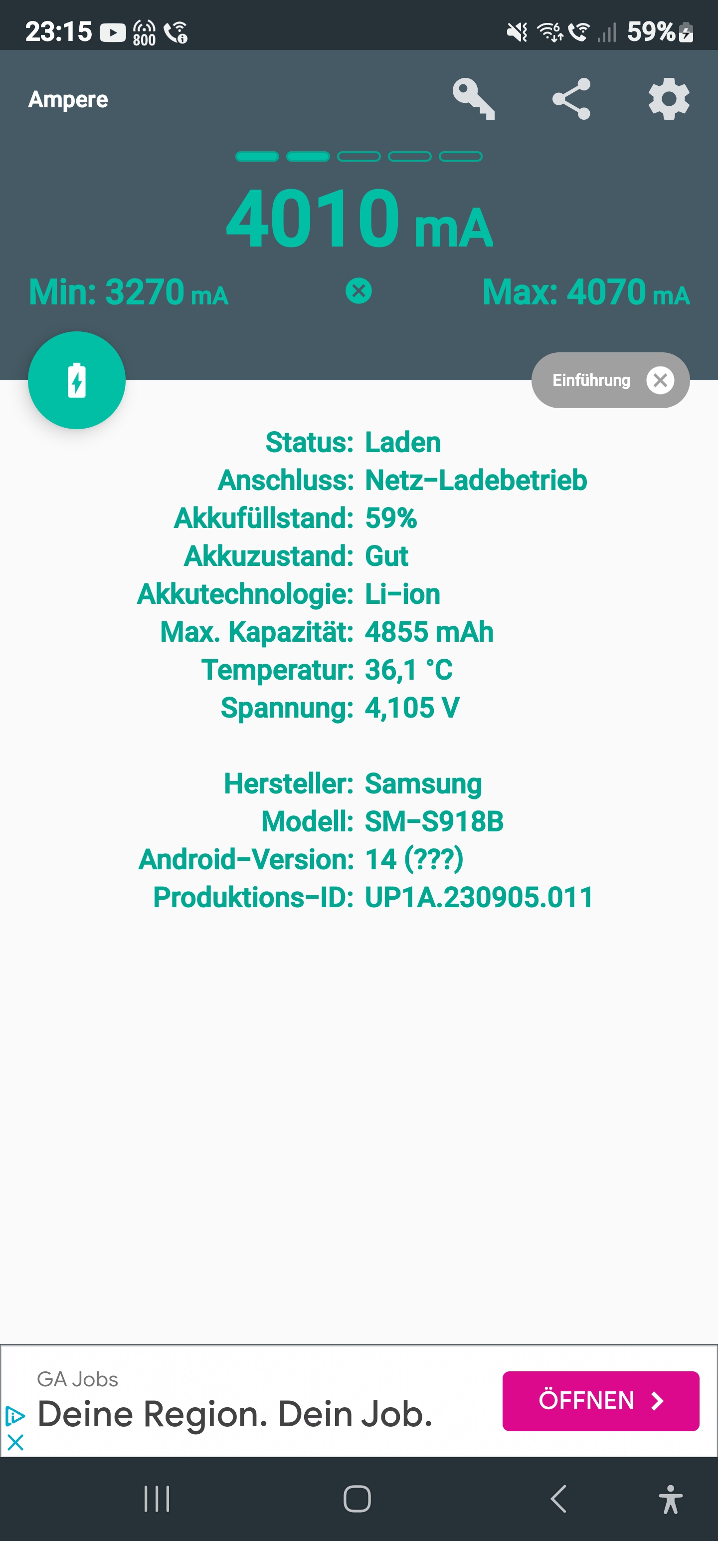 Mir ist nun aufgefallen, dass das S23 Ultra sehr lange braucht um aufgeladen zu werden. Hierbei ist es unerheblich, ob der Akku komplett leer ist oder noch ein wenig Kapazität aufweist. Für einen Prozent, braucht das Gerät auch mit aktiven Superschnellaufladen zwei bis drei Minuten. Bis dahin lud das Smartphone in drei Minuten in der Regel zwei bis drei Prozent.