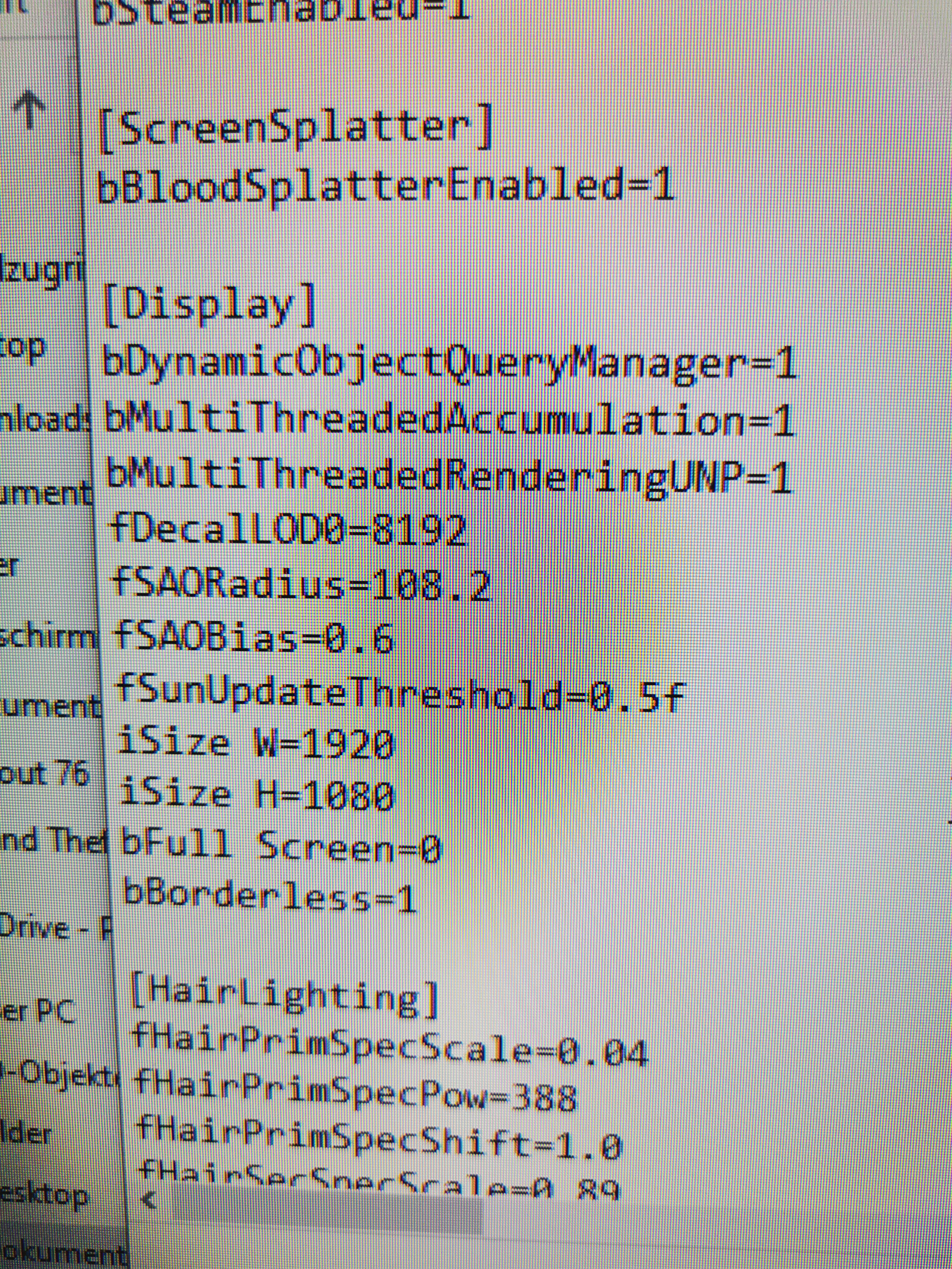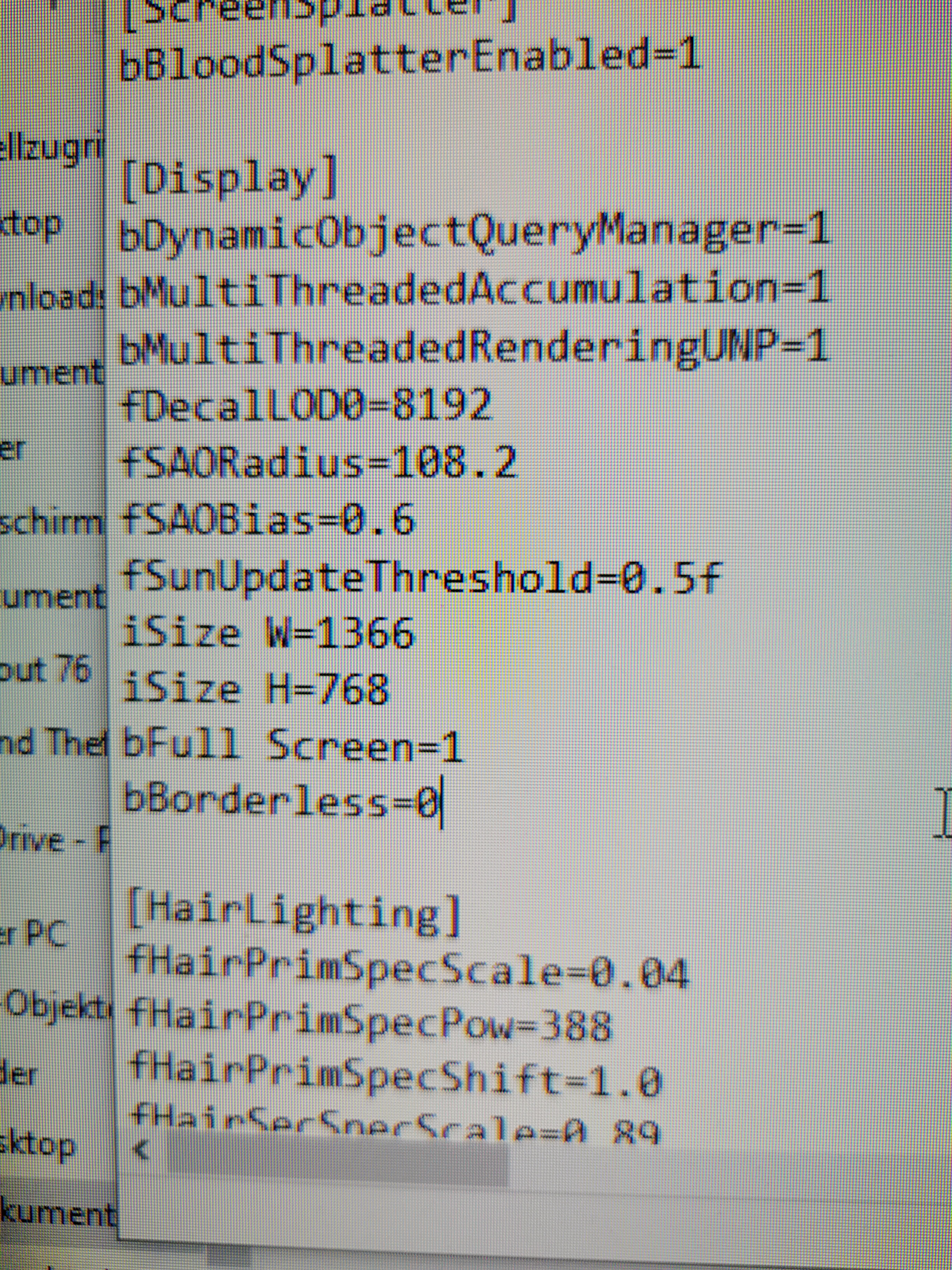 Dann lege mal im selben Verzeichnis eine Textdatei an mit dem Namen Fallout76Custom.ini und trage dort deine Werte für die native Auflösung 1360x768 ein und versuche noch einmal dein Glück! Am einfachsten kopierst du dazu den kompletten Display- Block aus der anderen ini und fügst ihn hier ein (auch mit dem Begriff Display in eckigen Klammern).