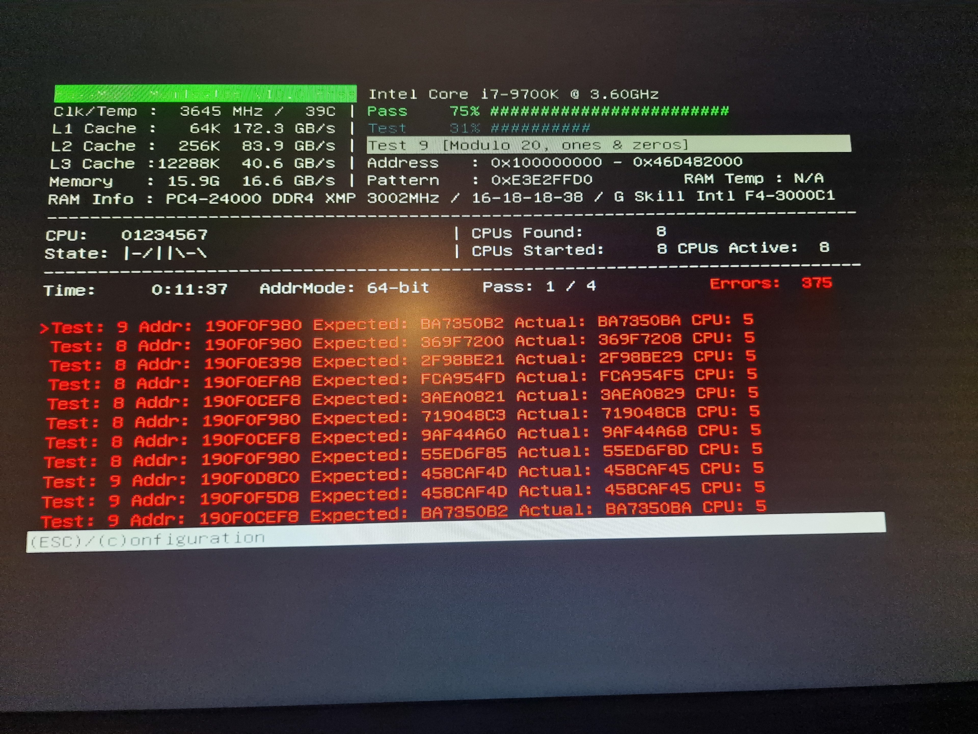 Vielen vielen Dank für eure Zeit , ich bin ein wenig überfragt mit der Fehlersuche , tatsächlich im memtest86 waren im ersten Pass nach ca 1 Std. über 440 errors. Wohlgemerkt im XMP 1 without noch nicht probiert.