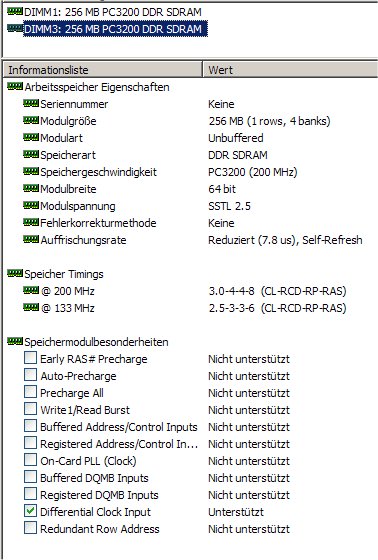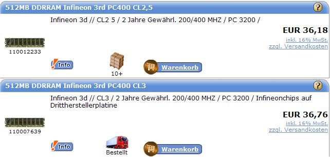 Ich tendiere nicht nur wegen der immo niedrigen RAM-Preise zu einer Aufrüstung desselbigen. Ich habe mich bei E-Bug schlau gemacht und folgende 512er Riegel gefunden (s. Anhang 1). Ich weiß aber nicht mehr, ob die eingebauten Riegel 2,5 CL oder 3 CL waren. Wie kann ich das in Erfahrung bringen? Außerdem bin ich mir bzgl. der Marke (Infineon) nicht sicher. In der Info der beiden Riegel habe ich folgendes gelesen: