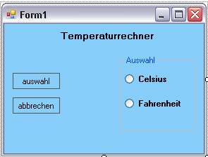 Nun möchte ich aber, dass man auswählen kann, ob man "Celsius->Fahrenheit" oder "Fahrenheit->Celsius" berechnen will. Nach der Auswahl mithilfe eines RadioButton drückt man auf den Button "berechnen". Daraufhin soll ein kleineres neues Fenster geöffnet werden in dem man die Temperatur eingibt und in dem dann auch der umgewandelte Wert angezeigt wird.