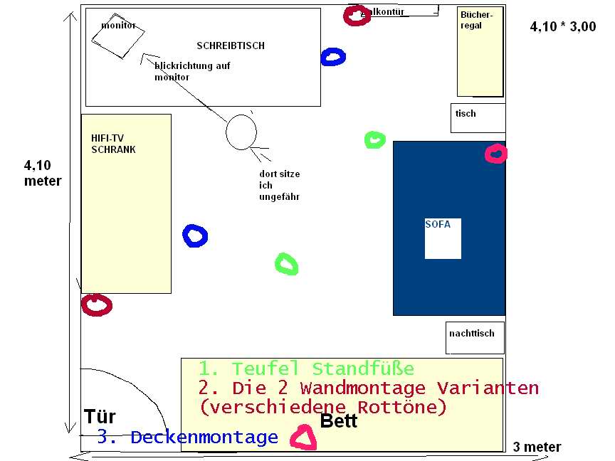 So: Problem: Wie ihr seht steht der schreibtisch nicht mittig im raum, da ich sonst meine balkontü´r nicht öffnen könnte.. deswegen werd ich die zwei front boxen halt irgendwie so montieren dass sie gleich weit entfernt sind.. nur das wirkliche problem jetzt: wol soll ich die REAR boxen hinmontieren? wenn ich sie ganzh am ende vom raum.. also an der gegenüberliegenden wand montieren würde, wären sie f+r meinen geschmack zu weit weg(denk ich jetzt ma.. sind ja immer hin 4 meter)