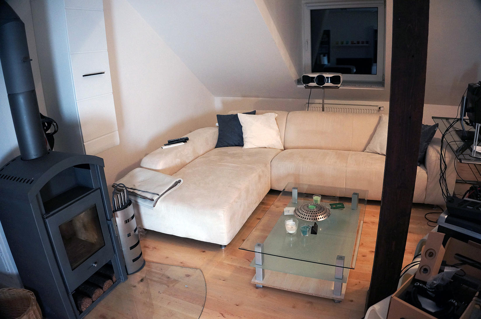 Mein Problem ist, dass ich nicht so recht weiß, wie ich die vorderen Lautsprecher aufstellen soll, da der rechte vordere Lautsprecher die Haupthörposition auf dem Sofa – aufgrund des dazwischenliegenden Kamins – nicht direkt beschallen kann.