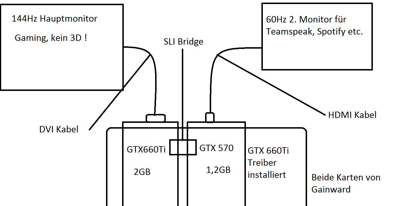 Ich habe zu meiner GTX 660 Ti eine GTX 570 geschenkt bekommen, und sie direkt neben meiner 660 Ti verbaut, und mit der SLI Bridge angeschlossen. (Kein Plan ob das was bei 2 verschiedenen Grafikkarten was bringt