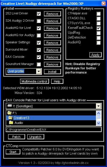 Allerdings warnt die ReadMe vor höherer CPU-Last durch den 324er auf einer Live!, beziffert wird dies mit max. 40% Last gegenüber 16% mit dem 252er unter DirectSound3D, getestet auf einem Celeron 500. So wird der 252er für die Live!-Serie empfohlen. Irgendwelche Vorteile/Unterschiede zu einem anderen Treiber kann ich wie gesagt leider nicht testen.