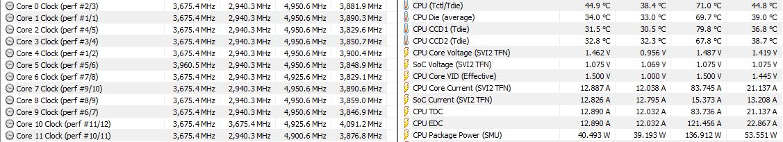Anfangs in Stock Boostete CCD1 voll auf 4950MHz auf allen Kernen und CCD2 auf 4800MHz auf allen Kernen. Beobachtet habe ich das indem ich einfach die Sensoren von HWInfo mitlaufen lies.