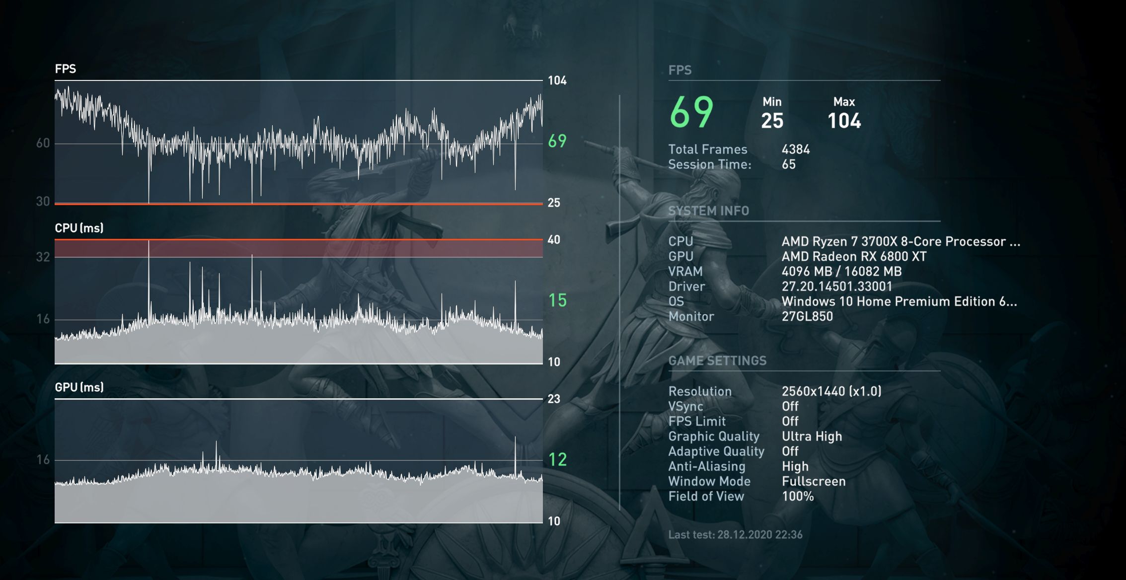 Hab jetzt gerade nochmal AC: Odyssey laufen lassen, alle Einstellungen auf max. außer Anti-Aliasing, das nur auf high, ansonsten ist die adaptive Qualität anscheinend automatisch an. Es macht anscheinend keinen Unterschied, ob SAM an oder aus ist, bei SAM an sind die min. FPS 25 und bei aus 23.