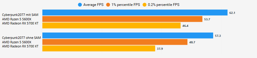 Community-Mitglied „mesohorny“ hat Smart Access Memory in Cyberpunk 2077 (Test) mit einem Ryzen 5 5600X auf einem MSI MAG B550 Tomahawk und einer Radeon RX 5700 XT getestet und dabei durchschnittlich 8 Prozent mehr FPS erzielt.