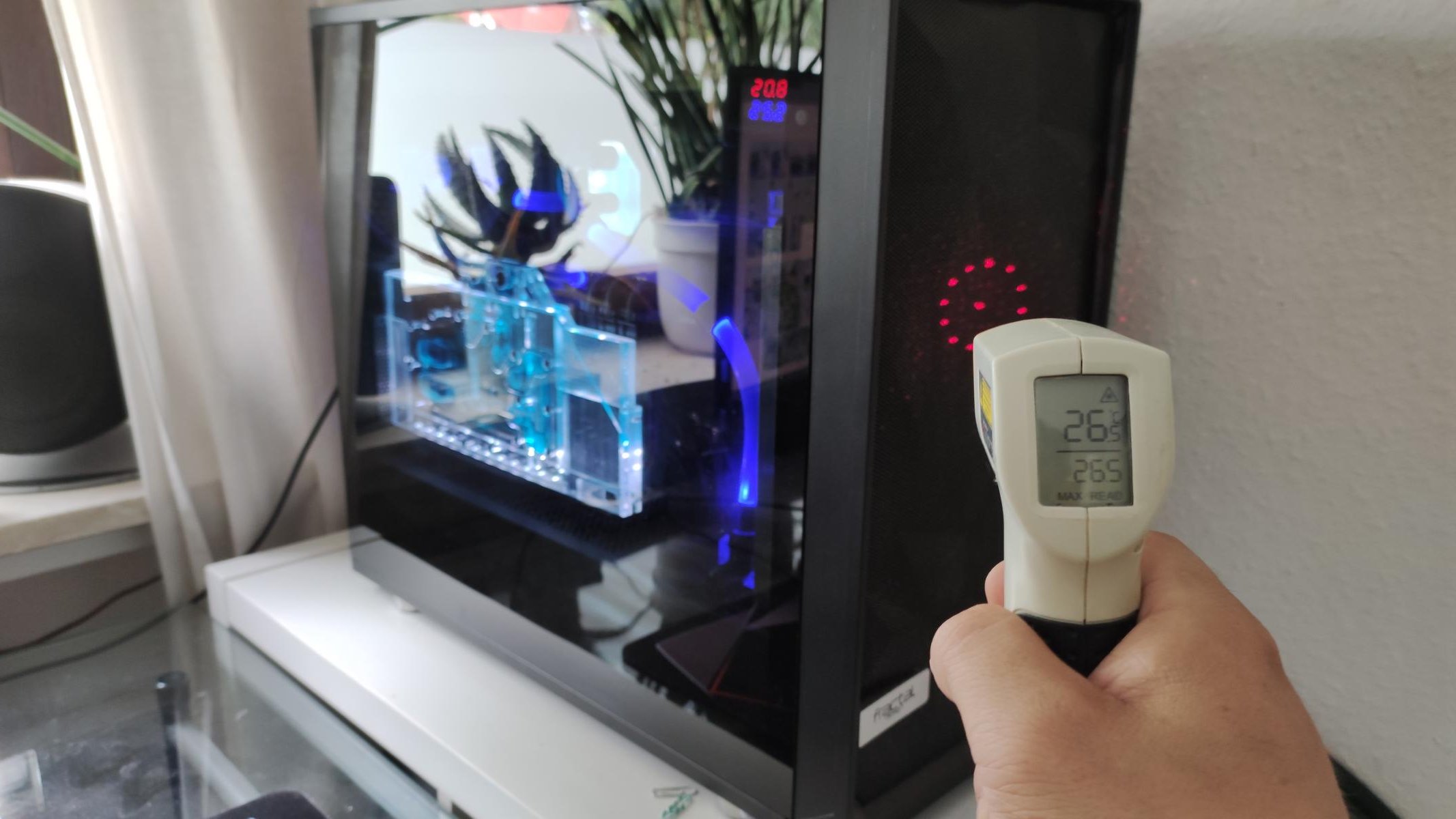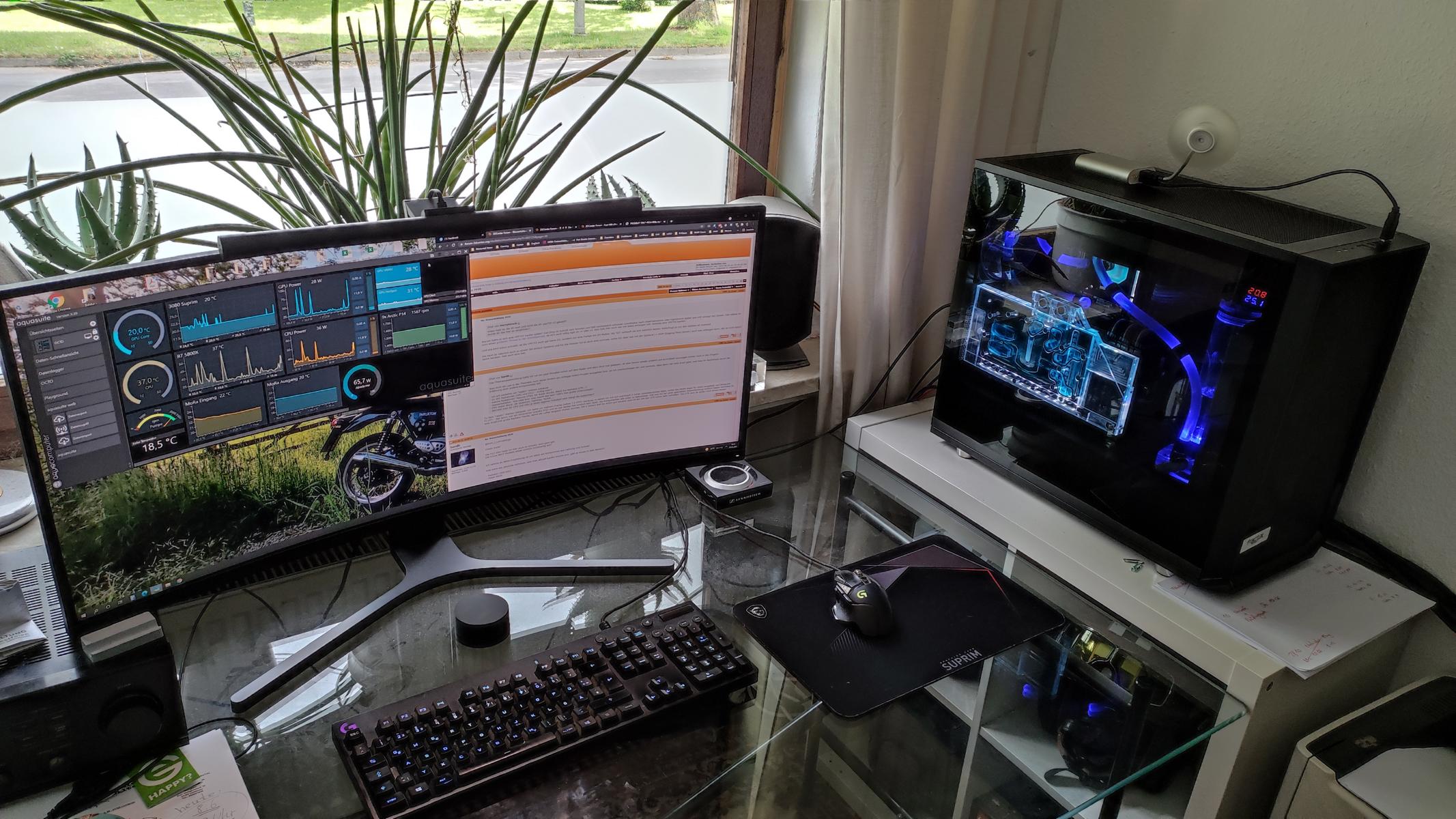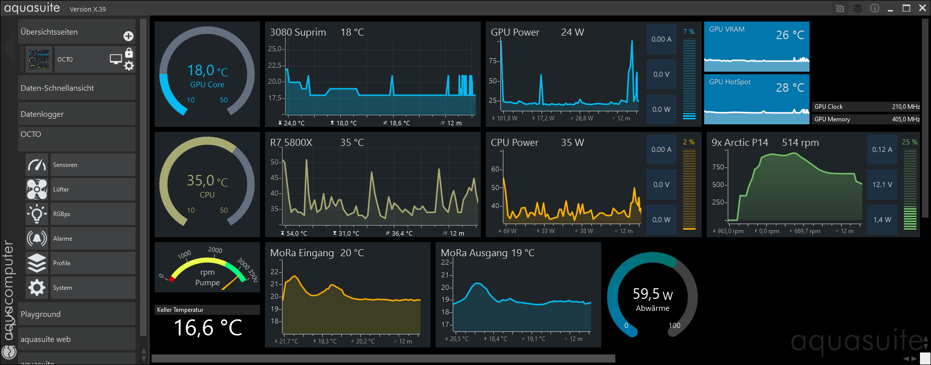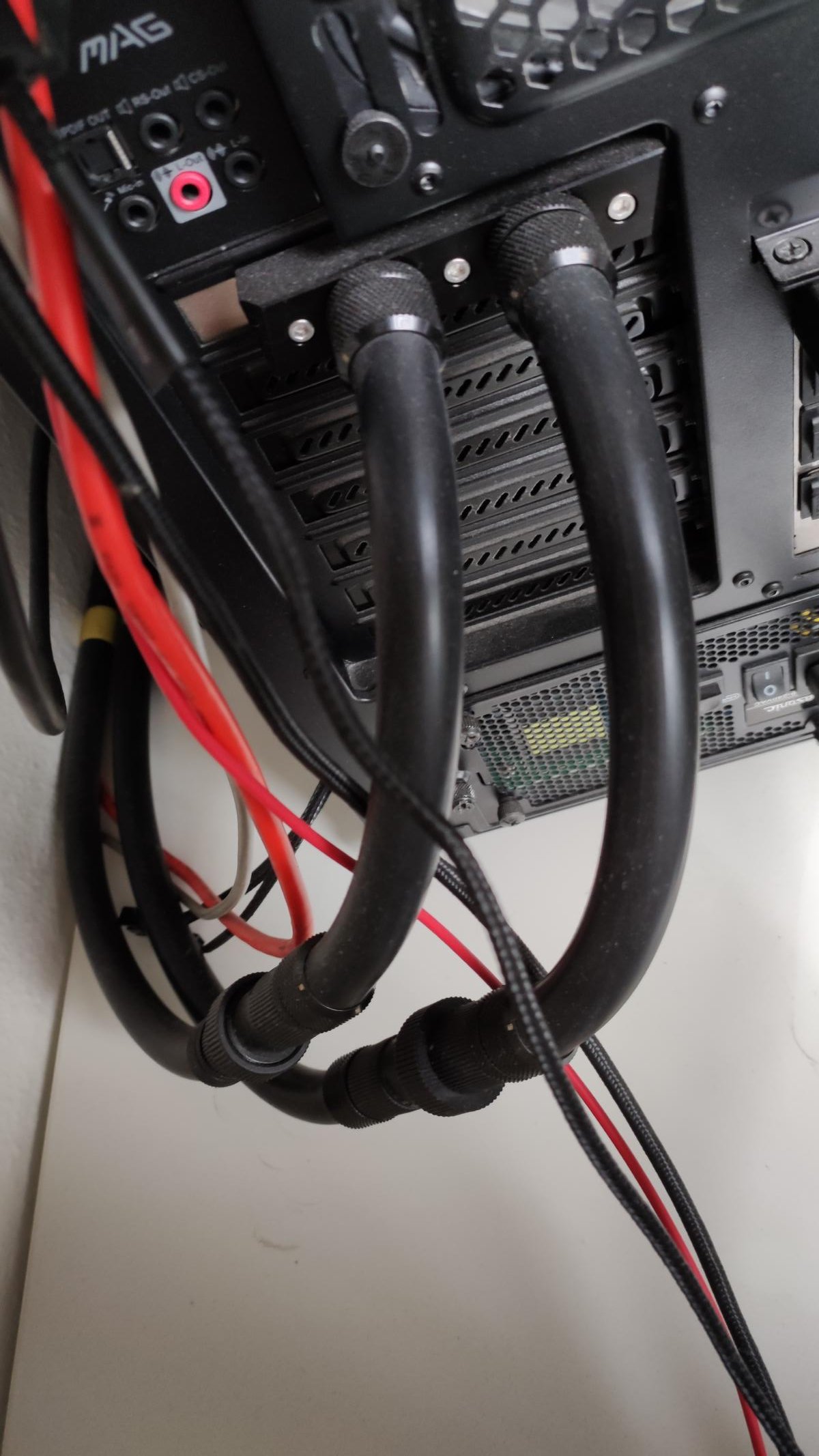 @AGB-Leser nein, meine Schläuche sind jeweils 10 Meter lang und es ist Winter, somit Luftfeuchtigkeit unter ~50% (wenn ich mir die Taupunkttabelle ansehen, ist da alles gut). Im Büro sind um die 22°C Raum durch Fußbodenheizung. Ist ja testweise nur aus dem Kellerfenster gehalten, um einfach mal selber die Temperaturen zu testen und was man alles monitoren kann. Jetzt gerade beim gaming komme ich bei ~450W Gesamt Abwärme (CPU/GPU) auf 26°C nach Mora und 5°C Umgebungstemperatur und 29,5°C nach CPU/GPU am Flowmeter. Was ich auch faszinierend finde, wie sich der Flowmeter bei den Wassertemperaturen (durch die Teilchen im Wasser) verändert. Jetzt bei 26°C 186l/h und bei ca 11°C Wasser waren es um die 90l/h.