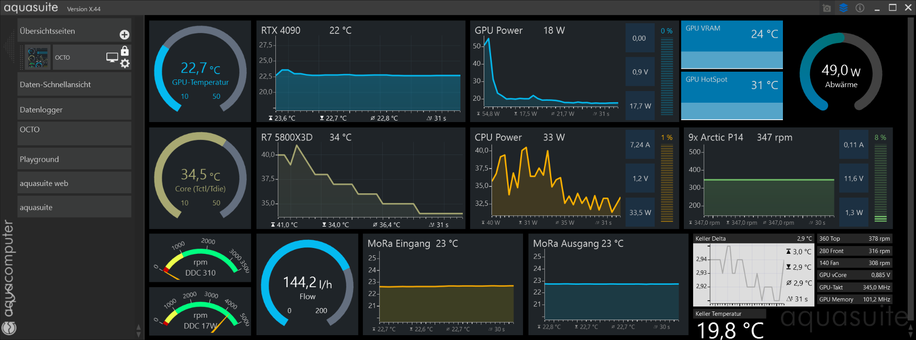 Die Lüfter sind so eingestellt das sie über die Drehzahl versuchen das Wasser +3°C über der Lufttemperatur im Keller zu halten. Das funktioniert über das ganze Jahr sehr gut und mit wenigen Drehzahlen. Bei Bedarf (Benchmarks/Stresstest) dürfen die Arcitic Lüfter auch 1500rpm drehen und sind vom Luftdurchsatz fast doppelt so stark wie die beim Mora auch sehr beliebten 200mm Lüfter von Noctua.