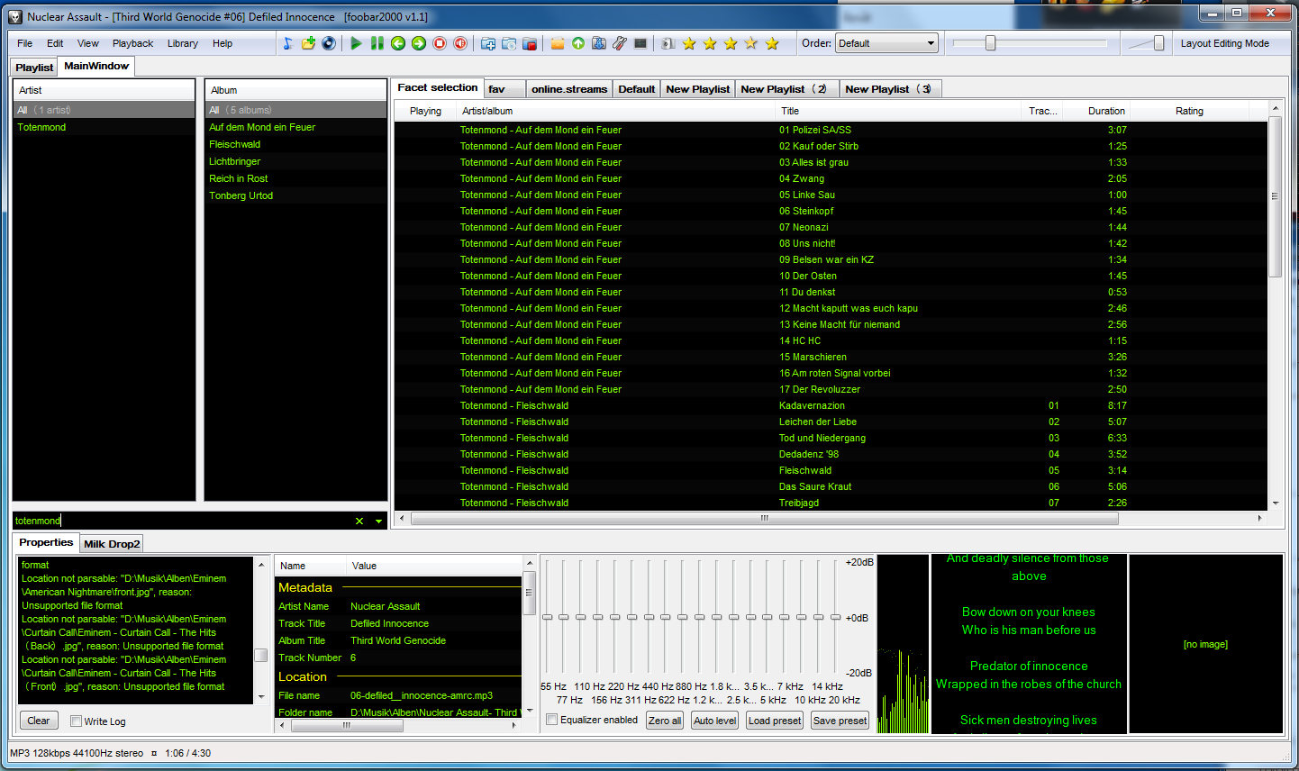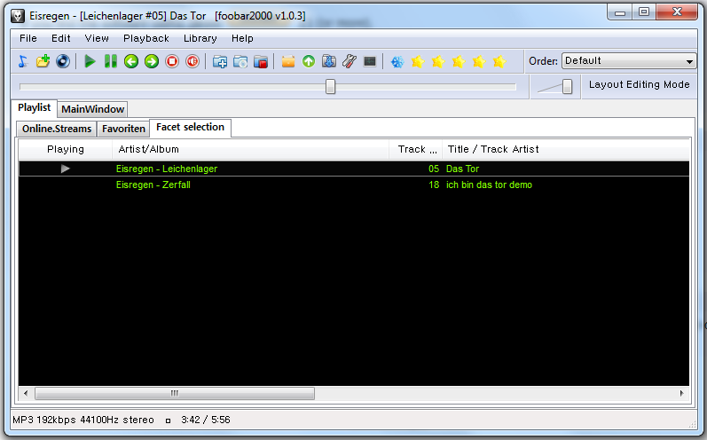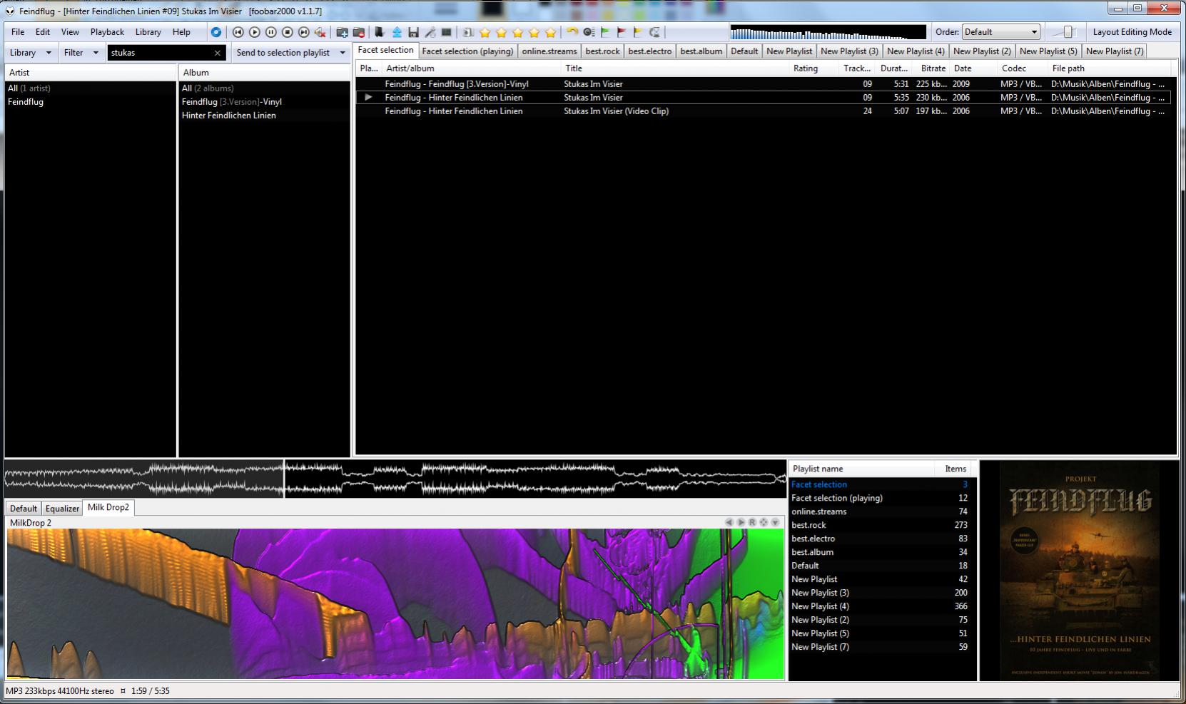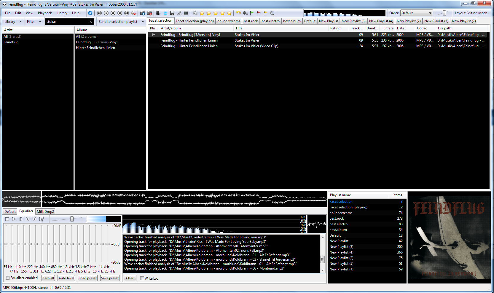 Foobar2000 ist ein ressourcenschonender Player der durch Erweiterungen individuell perfekt angepasst werden kann. Ich benutze in schon seit Jahren und es wird Zeit mal wieder ein bisschen dran rumzubasteln, vielleicht sogar vom DUI aufs CUI umzusteigen, da es noch schicker aussieht. Im Anhang findet ihr ein paar Bilder zu meinem Player. Natürlich hänge ich auch meine leider nicht ganz vollständigen Gedankenstützen zum Erstellen meines DUI an.