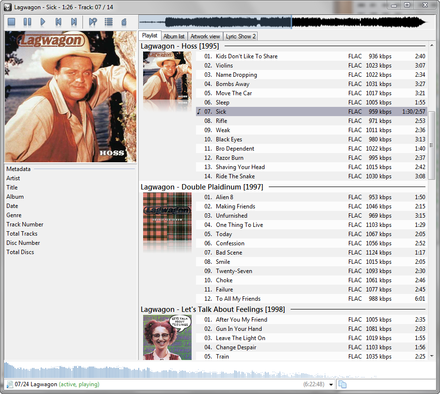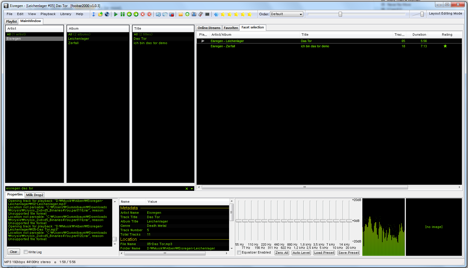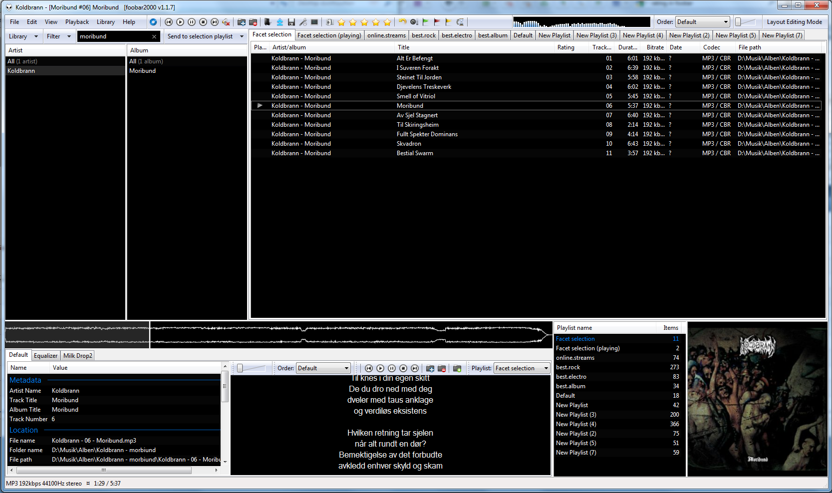 Foobar2000 ist ein ressourcenschonender Player der durch Erweiterungen individuell perfekt angepasst werden kann. Ich benutze in schon seit Jahren und es wird Zeit mal wieder ein bisschen dran rumzubasteln, vielleicht sogar vom DUI aufs CUI umzusteigen, da es noch schicker aussieht. Im Anhang findet ihr ein paar Bilder zu meinem Player. Natürlich hänge ich auch meine leider nicht ganz vollständigen Gedankenstützen zum Erstellen meines DUI an.
