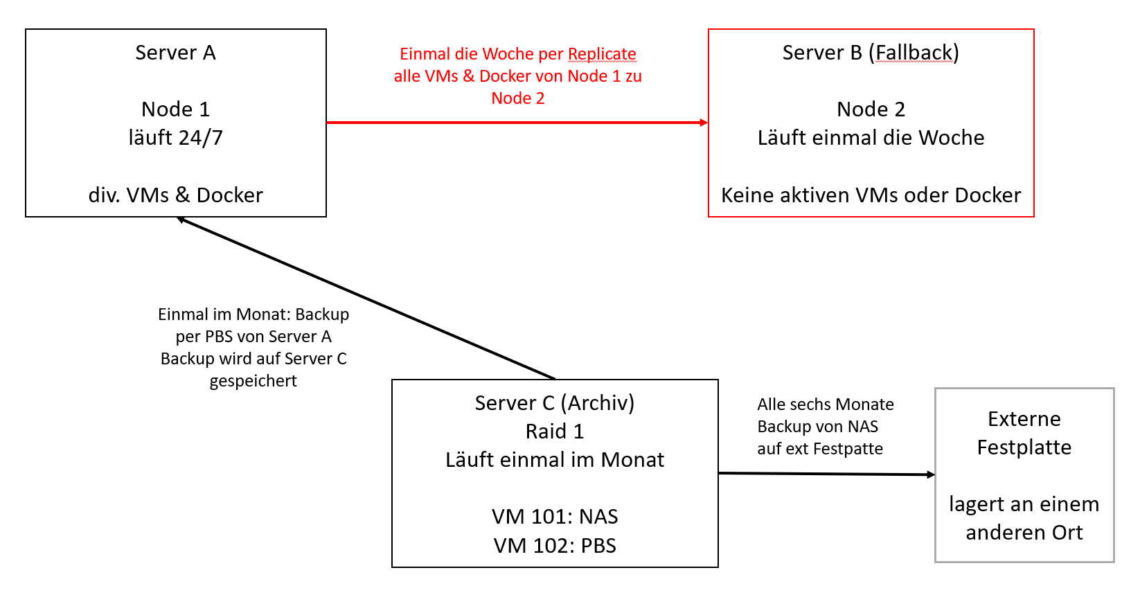 Backup ist ein zweiter, alter Xeon Server mit 2 4TB HDDs, welche in Raid 1 konfiguriert sind. Der Server läuft aber nur, wenn ich mal ein Backup erstelle, da er ein Idle Verbrauch von 40W hat.