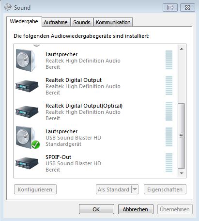 -Bei den Wiedergabegeräten (rechte Maustaste auf den Lautsprecher rechts unten) in Windows die Soundblaster HD als Standard gewählt.