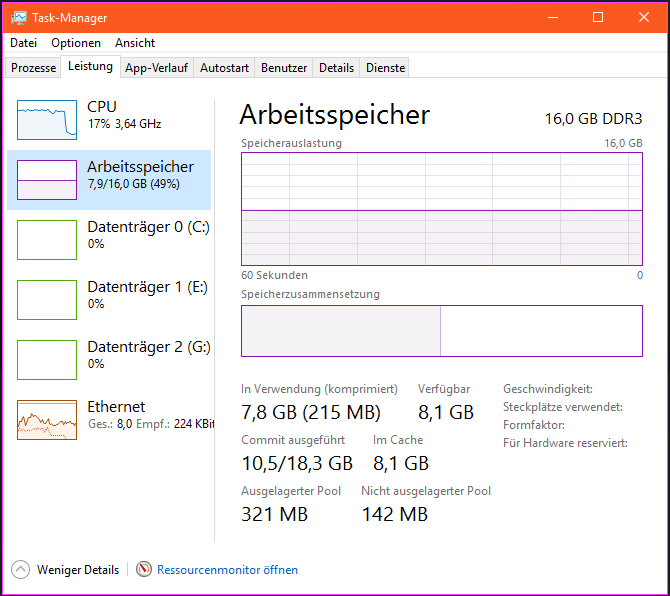 beeinträchtigt. Allerdings wird diese Auslagerung auto. vom System verwaltet und steht auto. auf rund 3GB. Also kann es eig. nicht sein, dass 10GB dort genutzt werden, oder? Ich habe euch mal relevante Screens gemacht. Ich muss dazu sagen, dass 2x4GB RAM separat auf 2 Slots aufgeteilt sind UND 1x8GB in einem dritten Slot stecken, ja, das macht man nicht so, ich weiß, aber jetzt ist es erstmal so, RAM wird arsch teuer! Vom System erkannt werden auch (siehe Taskmanager) volle 16GB, aber werden diese auch in Games angesprochen? Ich habe das Gefühl, nein, es werden die beiden 4GB Riegel gefüllt und der Rest von der Auslagerung genommen.