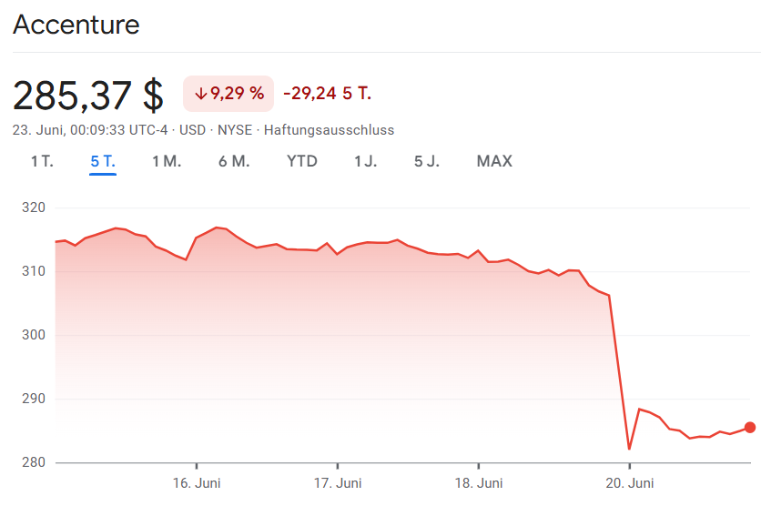 Am 20.6. war der Earnings Call von Accenture und der Ausblick hat nicht die Erwartungen erfüllt. Der Kurs hat mit dieser Ankündigung ziemlich sicher gar nichts zu tunSaxnPaule schrieb: