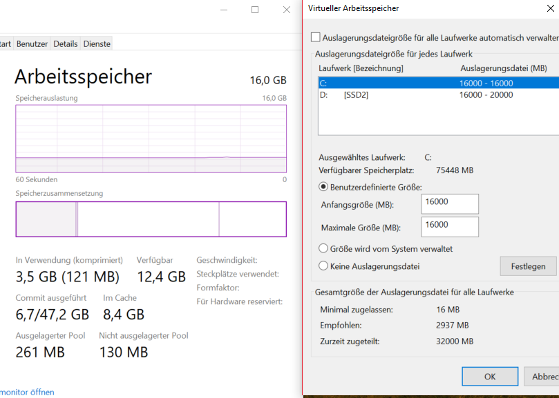 Auch wenn ich die Auslastungsdatei komplette deaktiviere, zeigt sich das gleiche Bild. (RAM: 7500MB, Auslastungsdatei: 12000MB)