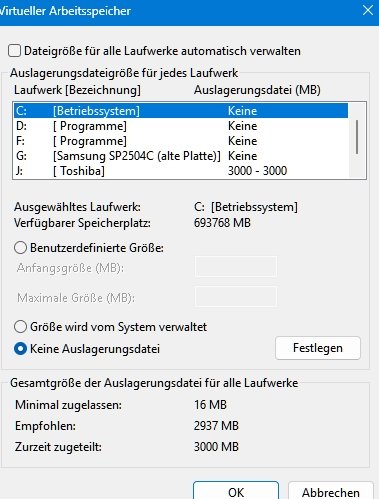 Ich habe unter Erweiterte Einstellungen bei allen Laufwerken "Keine Auslagerungsdatei" festgelegt und bei E: dann Systemverwaltet.