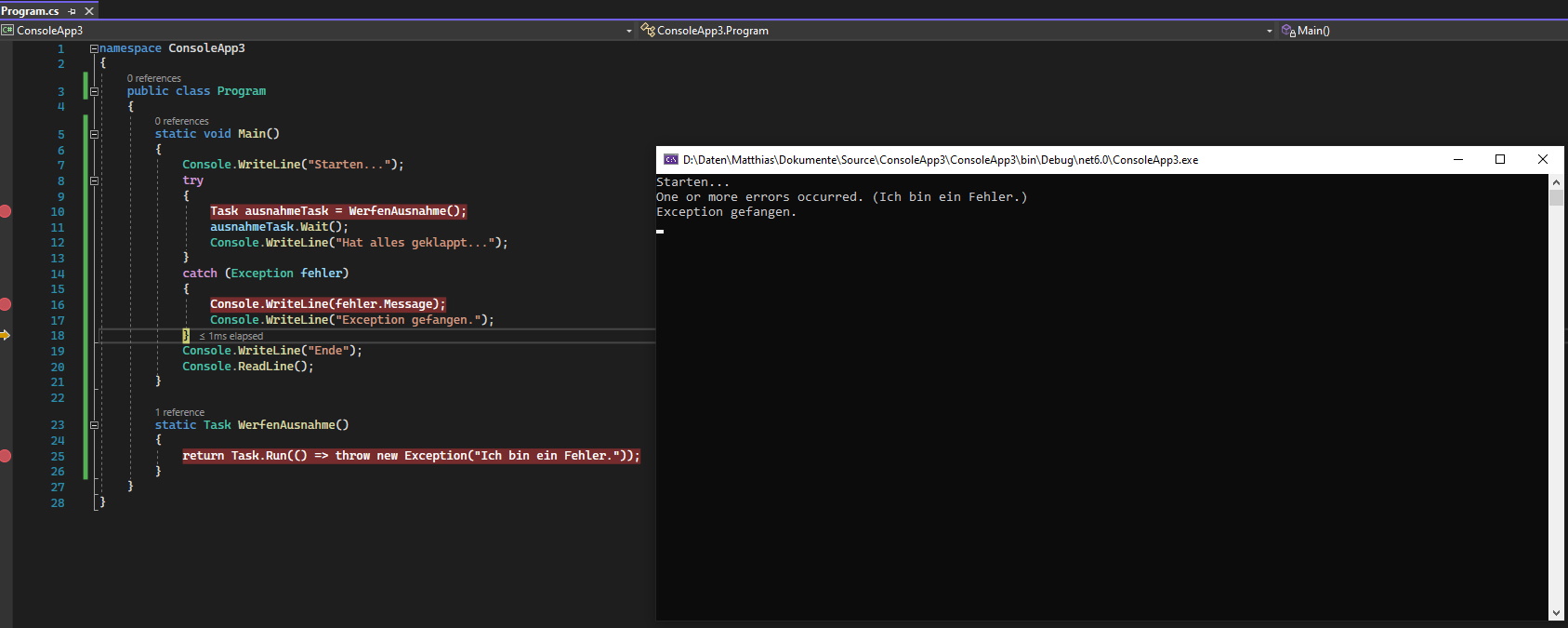 Ok, aber ehrlich gesagt seh ich gar keinen relevanten Unterschied zu Deinem ersten Code, oder ich hab Tomaten auf den Augen. Nur das Du das task.Wait nicht mehr in einer Methode aufrust, sondern direkt in Main, das macht aber keinen Unterschied. Hab Deinen Code aus dem ersten Post mal ins Visual Studio eingefügt, er funktioniert wie erwartet, die Exception wird gefangen und auf der Console ausgegeben. Und auch der Debugger hält dort an. Weiß aber nicht mehr, was ich da evtl. mal eingestellt habe, wo er halten soll und wo nicht.