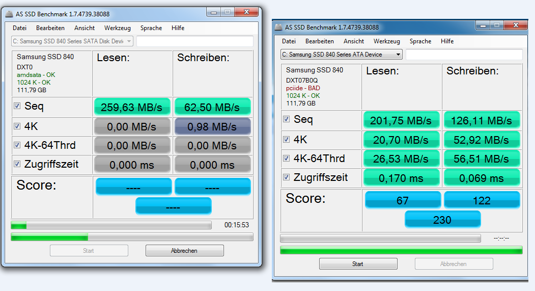 Nichtsdestotrotz halte ich es für wahrscheinlich, dass die 840 inkompatibel zu deinem System ist oder defekt. Generell sind die Samsung SSD 830/840 bei nicht mehr ganz aktuellen Chipsätzen problematischer als manch andere SSD. Sofern du Umtauschen willst, würde sich eine Crucial m4 oder eine Plextor M5S empfehlen. Die harmonieren i.d.R. auch mit älteren Chipsätzen gut.