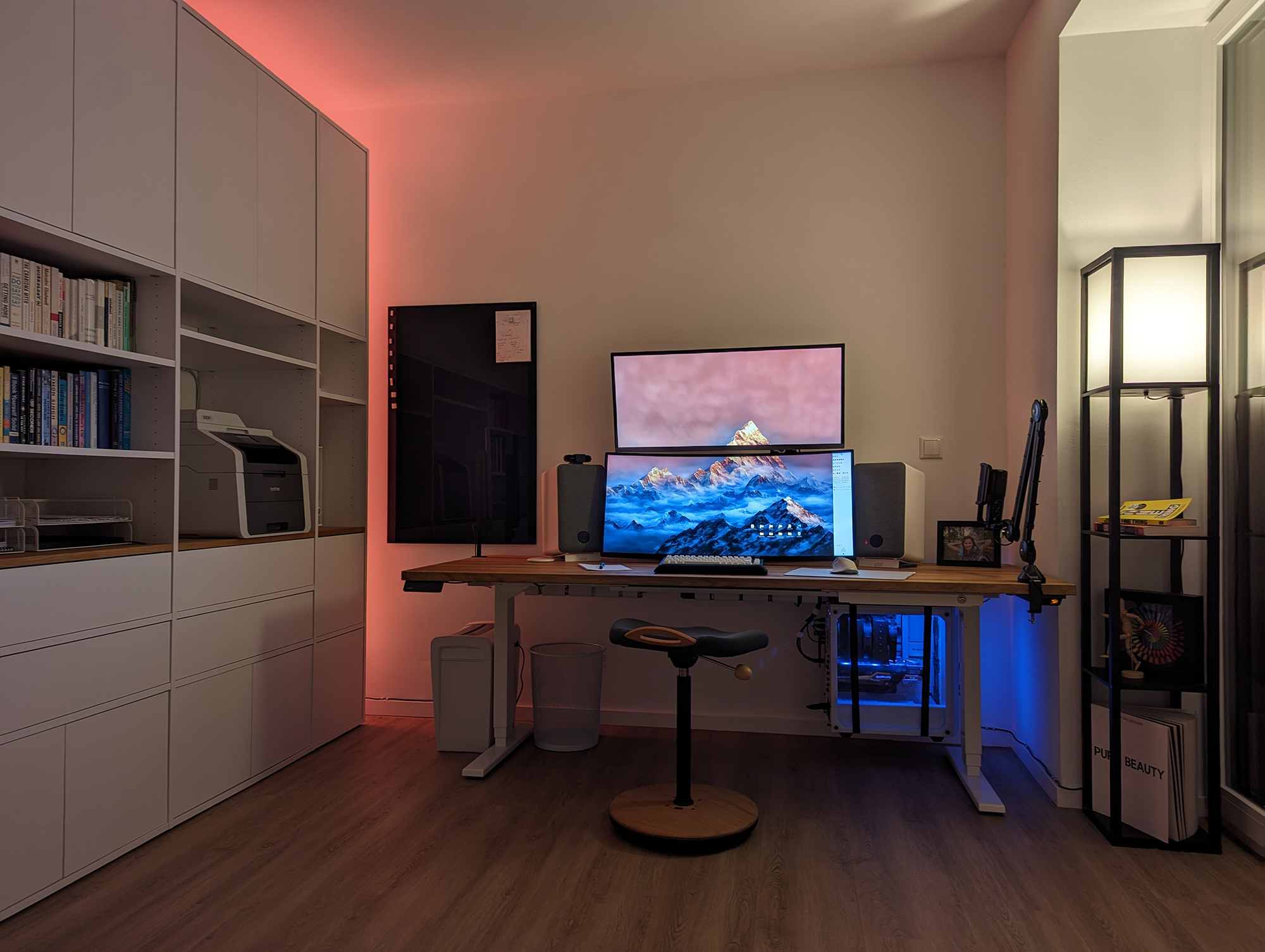 Ich habe im Dezember meinen ca. 100 Jahre alten, wurmstichigen Holzschreibtisch im Stil der Ägyptomanie durch einen modernen, höhenverstellbaren Tisch (Leetdesk mit den Maßen 160cm x 80cm) ersetzt und bin damit sehr zufrieden. Links steht der Rechner im Mini-ITX-Gehäuse, in der Mitte der 32-Zoll-Monitor mit platzsparender ScreenBar anstelle einer traditionellen Schreibtischlampe, rechts befindet sich ein Würfellautsprecher (MuSo QB2). Außerdem gibt es noch eine 65%-Tastatur, eine Vertikalmaus und eine Deskmat. Alles vornehmlich in anthrazit gehalten, sodass einmal pro Woche natürlich Staubwischen angesagt ist...