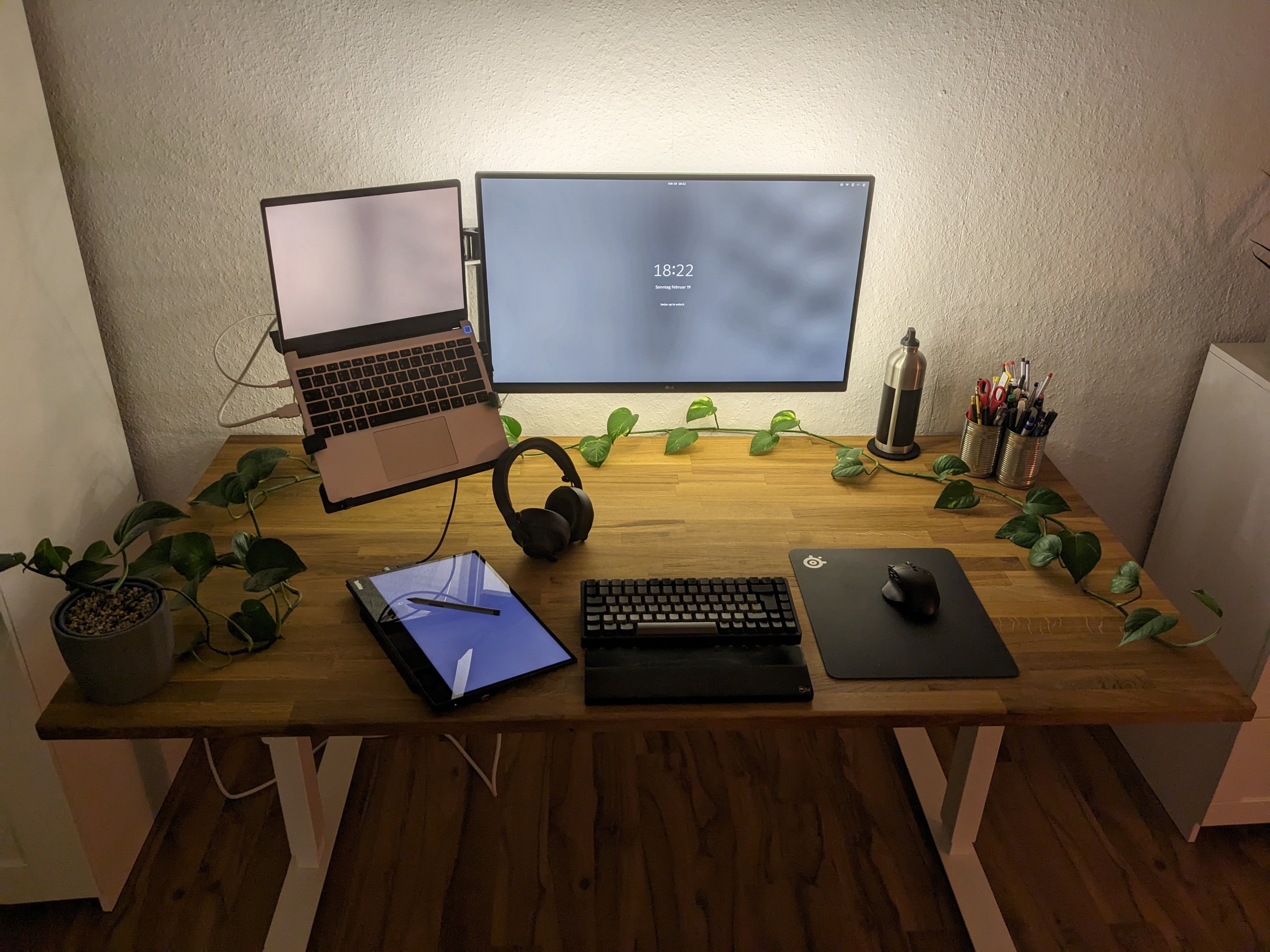 27 Zoll 4k von LG, daneben der Framework Laptop und darunter mein Schätzchen, ein externer Touchbildschirm. Ist wirklich ein krasser Game-Changer gewesen, weil ich viel mit digitalen A4-Dokumenten arbeite.