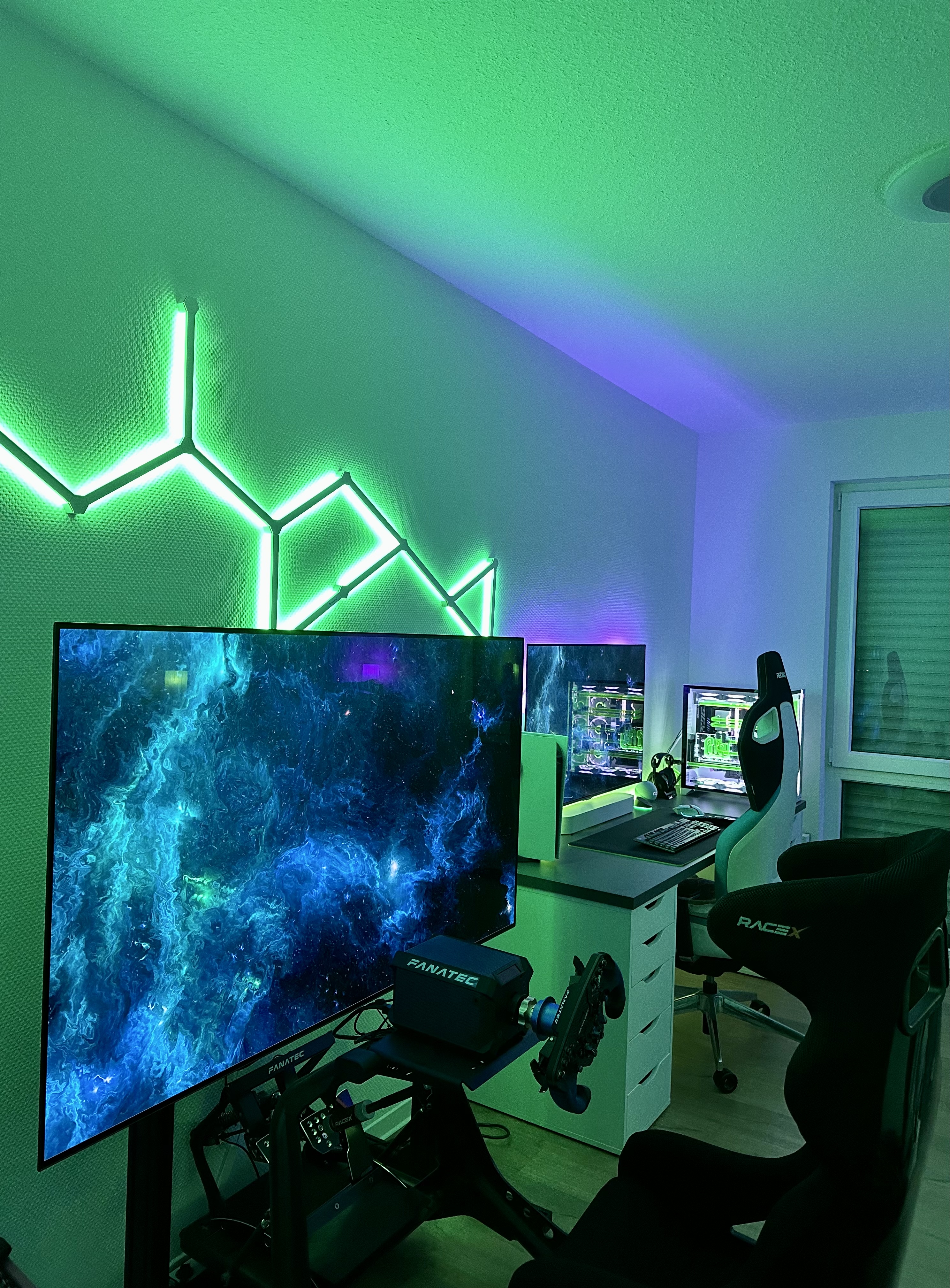 Auf der weißen Truhe kann man schön die Füße hochlegen. Sieht unbequemer aus als es ist. Setup wird als Home-Office und leider immer weniger zum zocken genutzt.