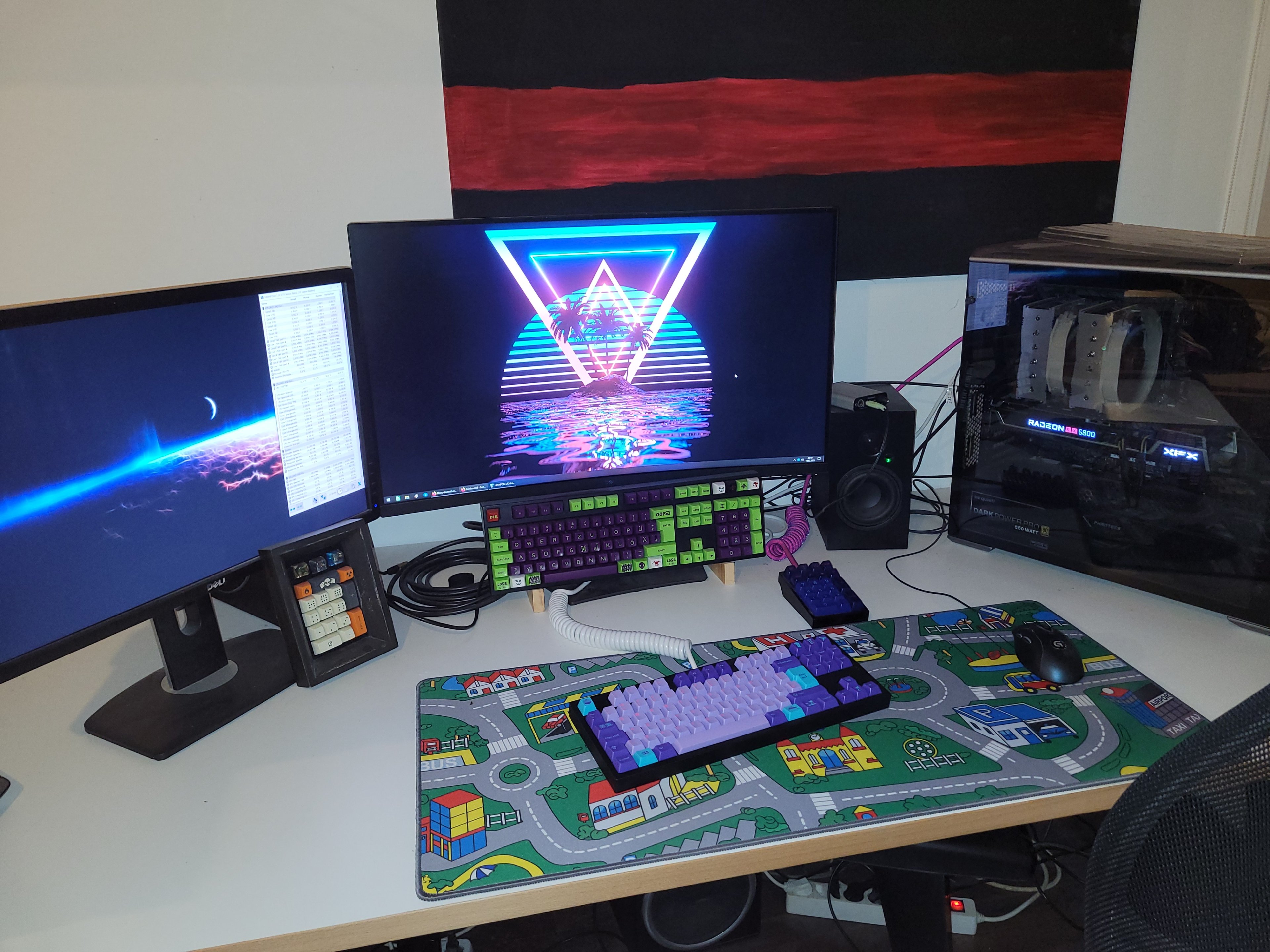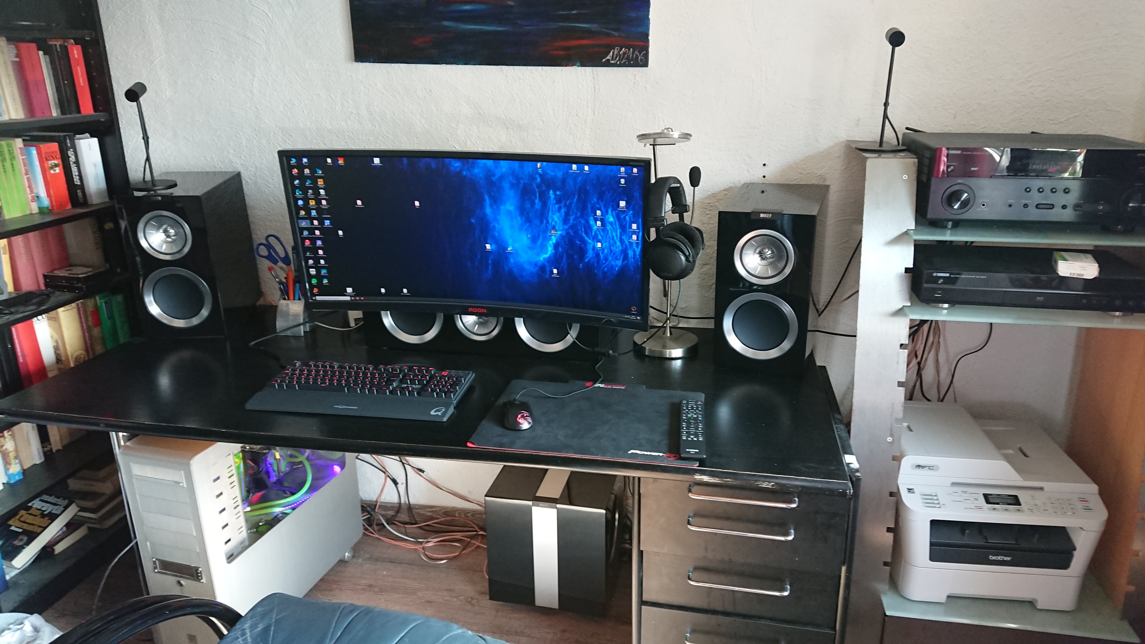 Nicht aktuell und aktuell nicht Zuhause, trifft es aber ganz gut, neu sind eine Samsung Soundbar die bei Bedarf genutzt wird und unter dem mittigen Monitor steht, ein Kopfhörerhalter rechts am Rand, Ein Bilderrahmen und 2 handgefertigte AmongUs Plüschis mit Namen. Das Gehäuse steht auf dem Boden Und ein Wish-Elgato Streamdeck eines alten Tablets ist in Arbeit. Auf einem Flexispot E5 glaube mit Massivholzplatte. Leider damals nur 1,60m genommen. Kein RGB.