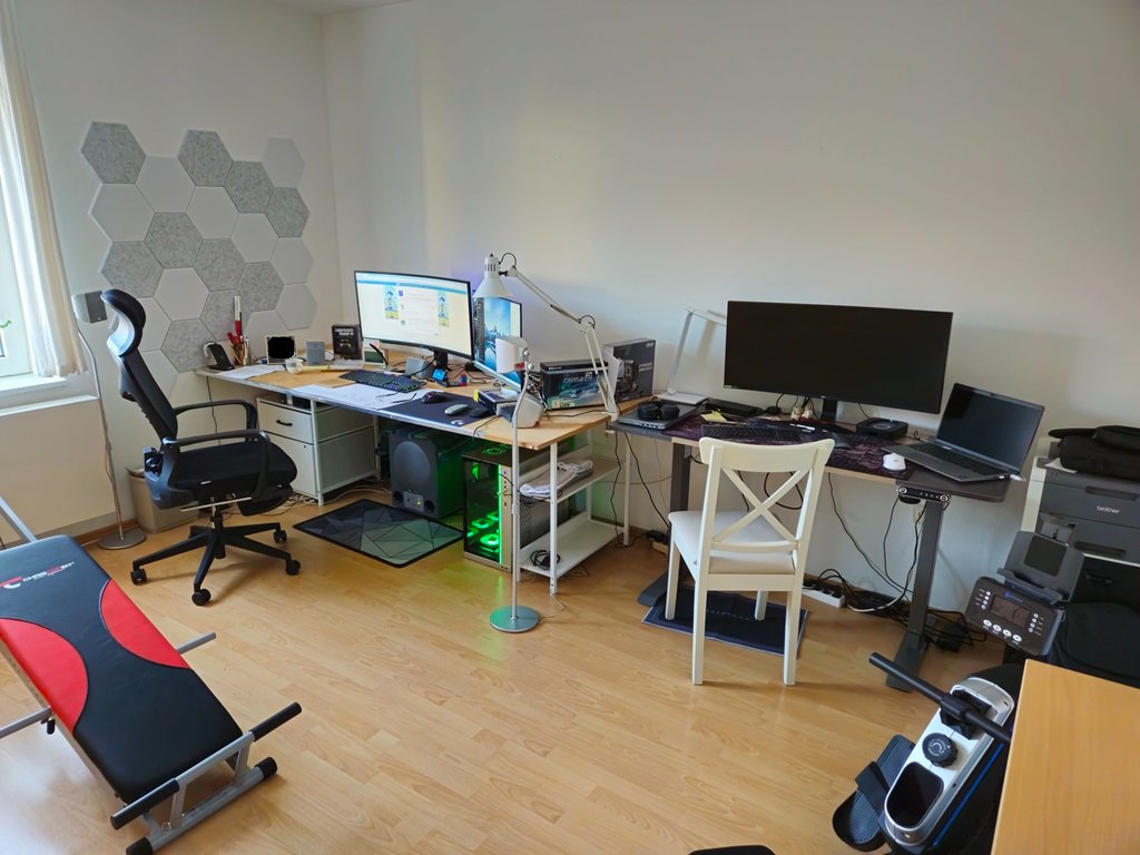 Dann will ich auch mal wieder. Bin mittlerweile umgezogen und Corona sei Dank, gibt´s ja jetzt auch das mobile arbeiten. Dafür habe ich mir extra dann einen höhenverstellbaren Tisch (rechts der mit den NB´s) gekauft.