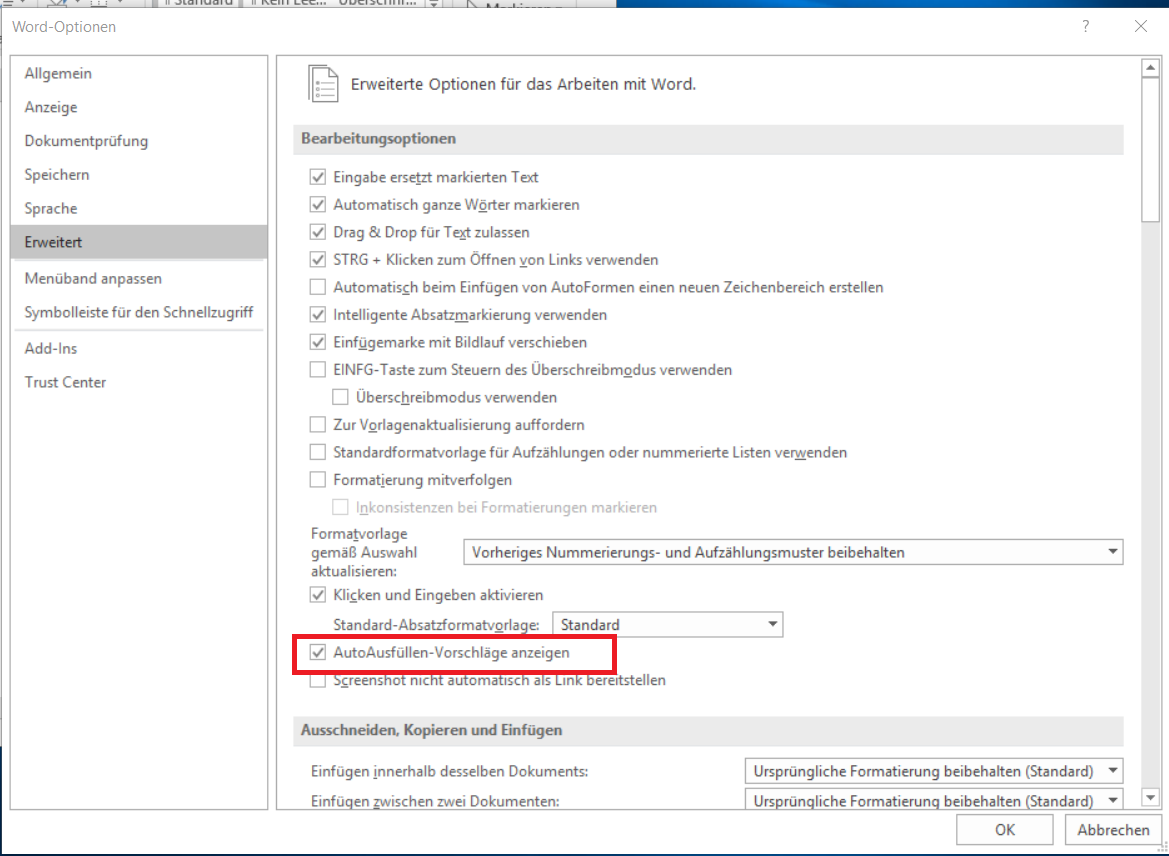 Ich möchte das Auto-Ausfüllen (NICHT die Auto-Korrektur) in Office 2016 deaktivieren.