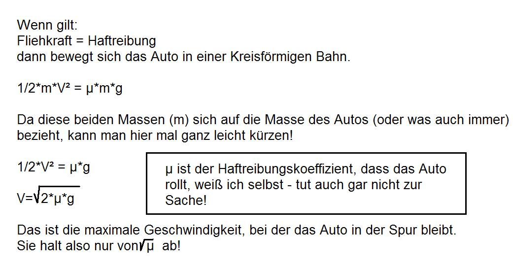 das ist ja nur die halbe Wahrheit. Ein Auto wird sich spätestens aus der Spur machen, wenn die Belastung ausreicht, um den Übergang Haftreibung->Gleitreibung zu erzeugen (der Fall Zentrifugalkraft <> Zentripedalkraft wurde ja schon hinreichend diskutiert). Dann wird der Reibungskoeffizient nämlich bedeutend kleiner. Ein weiteres Problem ist die Lage des Schwerpunktes (was ja bis jetzt ganz außer Acht gelassen wurde, der Einfachheit halber). Damit wird die Kraft auf die außenliegenden Räder noch weiter erhöht (Dummerweise will ja nach Galilei das Auto den linearen Weg beibehalten).