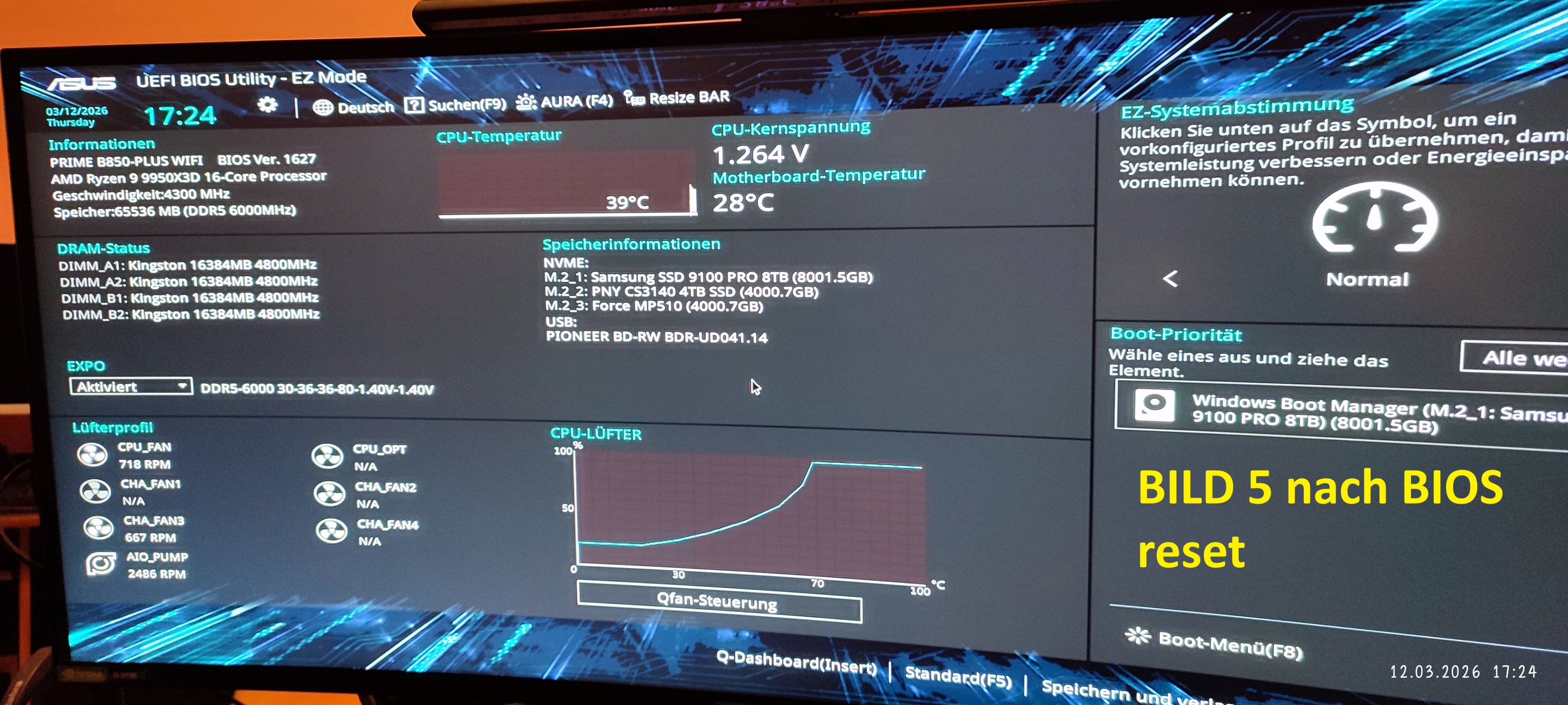 Ich hatte nach dem BIOS Reset dann plötzlich diese Daten von Bild 6. 5600MHz.. es schien auch zu liefen und KI hat es mir bestätigt. Dann hatte ich nochmal ein BIOS Reset am Schalter von Mainboard gemacht, dann ergab sich Bild 7 mit 6000MHz... da wurde ich aber Misstraurisch und fragte die KI, der Ram kann max. 1.4V und war Grundwert bei 1,120 V.. ich habe dann daher nicht lange getestet, gar nicht mal Windows hochgefahren...