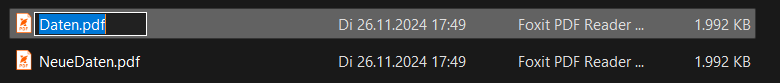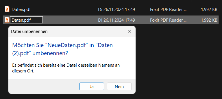 Die "NeueDaten.pdf" soll jetzt einfach den Namen "Daten.pdf" erhalten. Wenn ich jetzt den Name "Daten.pdf" kopiere und bei "NeueDaten.pdf" einsetzte, fragt mich Windows, ob ich "NeueDaten.pdf" in "Daten.pdf (2)" umbennen will.