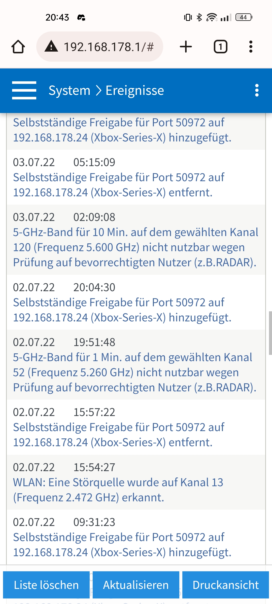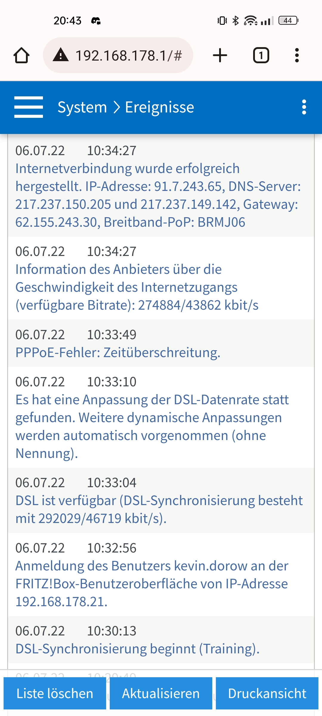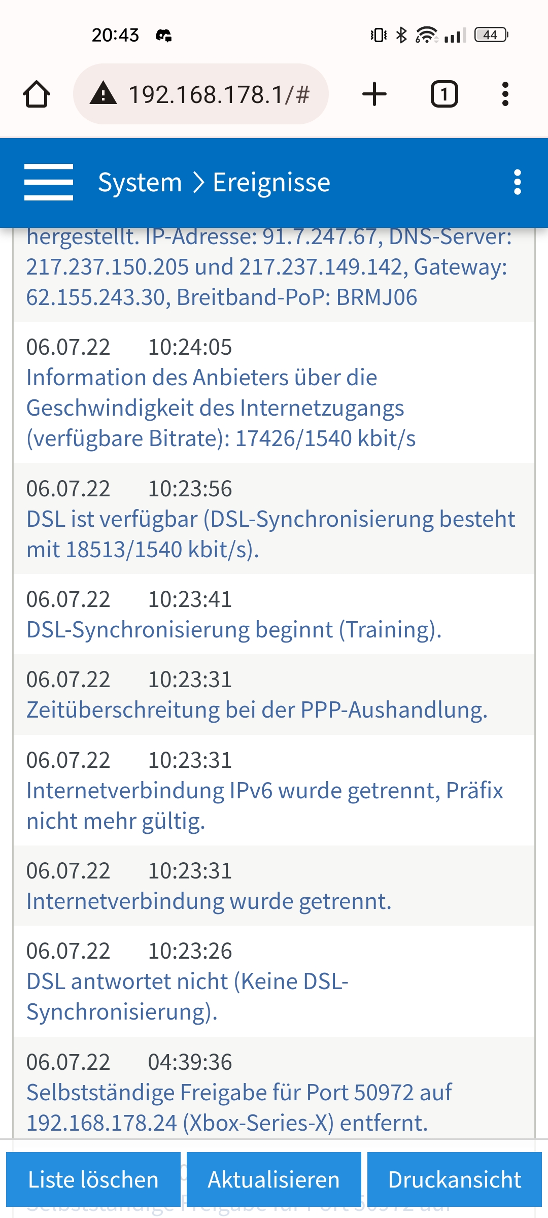 Zuerst aufgefallen ist es mir vor ein paar Tagen, als ich mit Kollegen nachts um 02:09 Uhr ein paar Runden Valorant spielen wollte. Ich bin regelmäßig rausgeflogen, obwohl der Router über die LEDs nichts angezeigt hat. Spätestens als unser iPad ebenfalls Probleme hatte, wurde ich stutzig und habe mir die Ereignisse des Routers angeguckt, dabei gab es vor ein paar Wochen schon einmal solche Probleme.