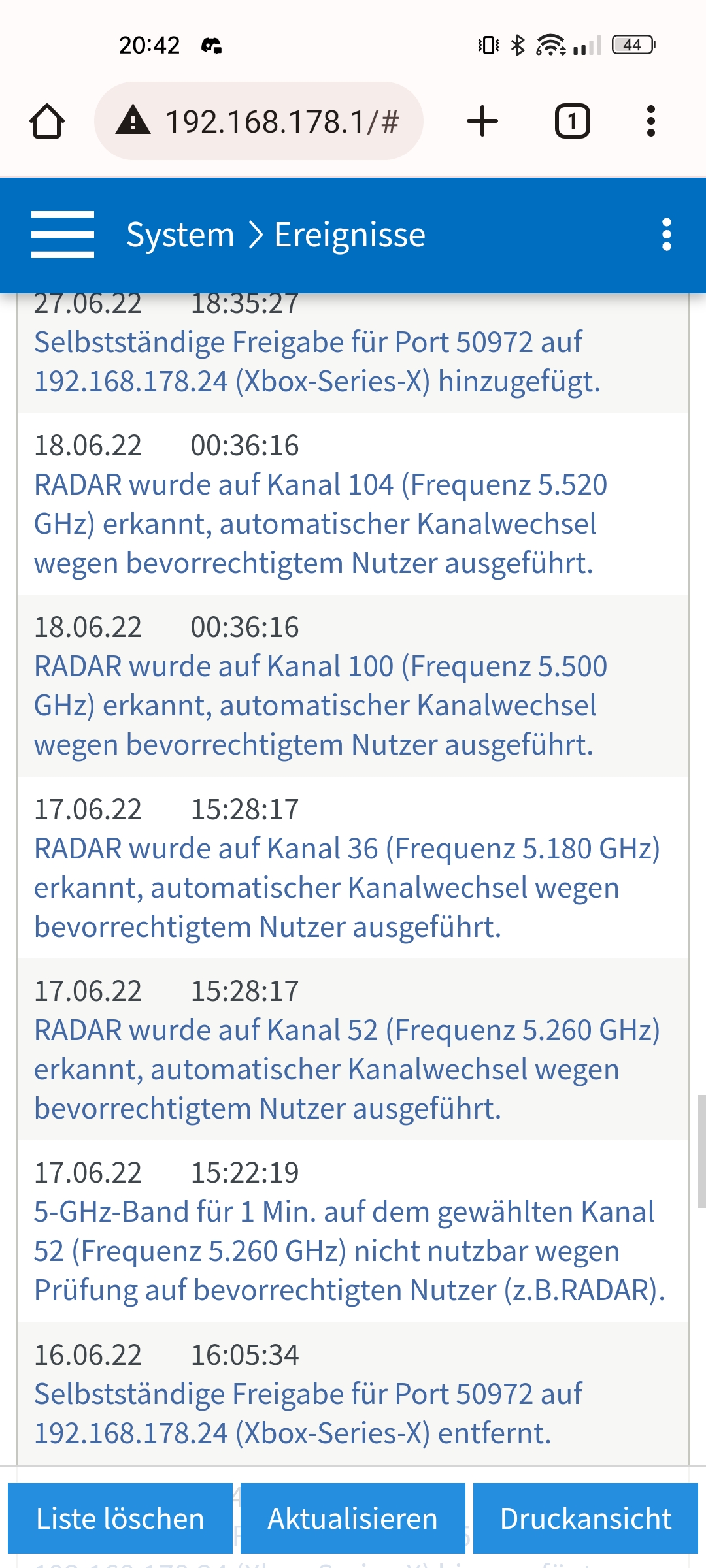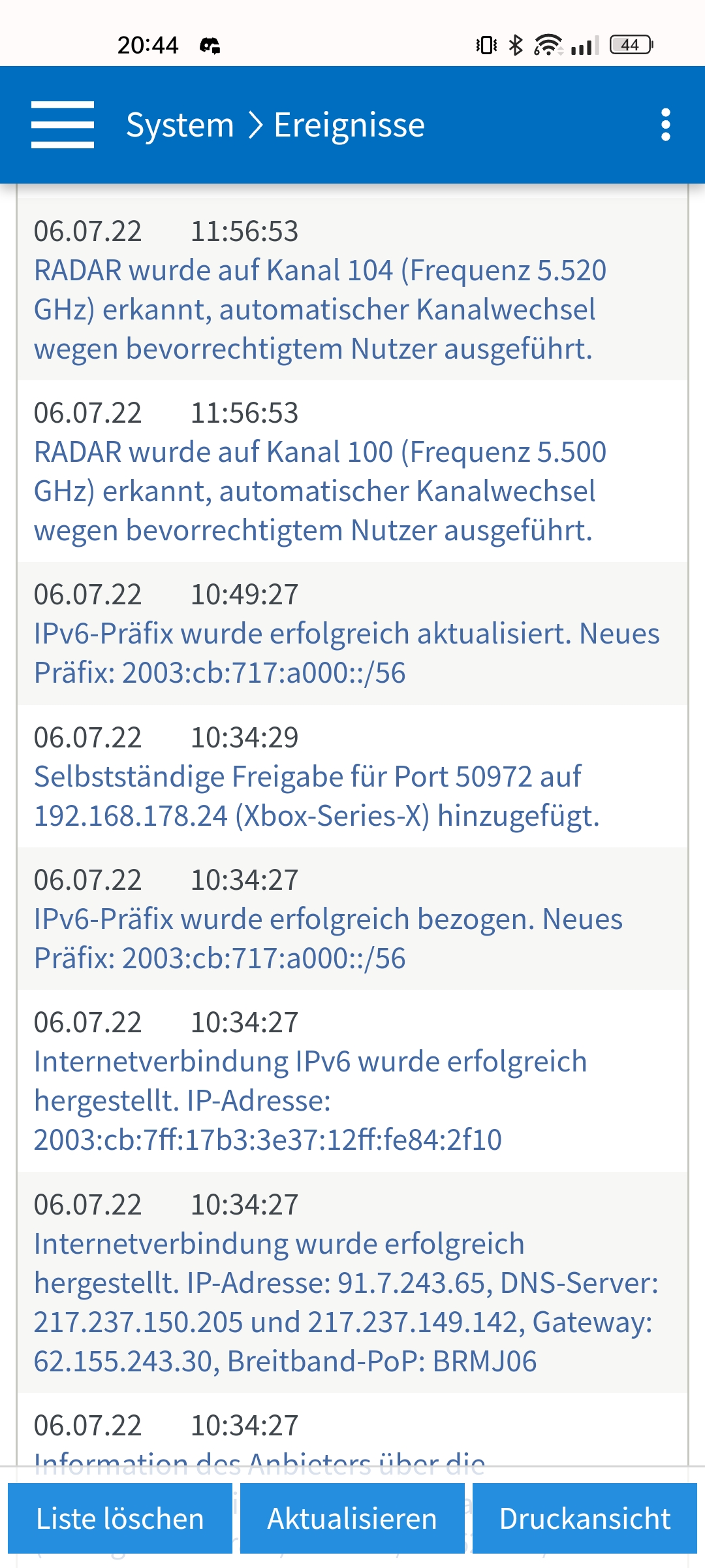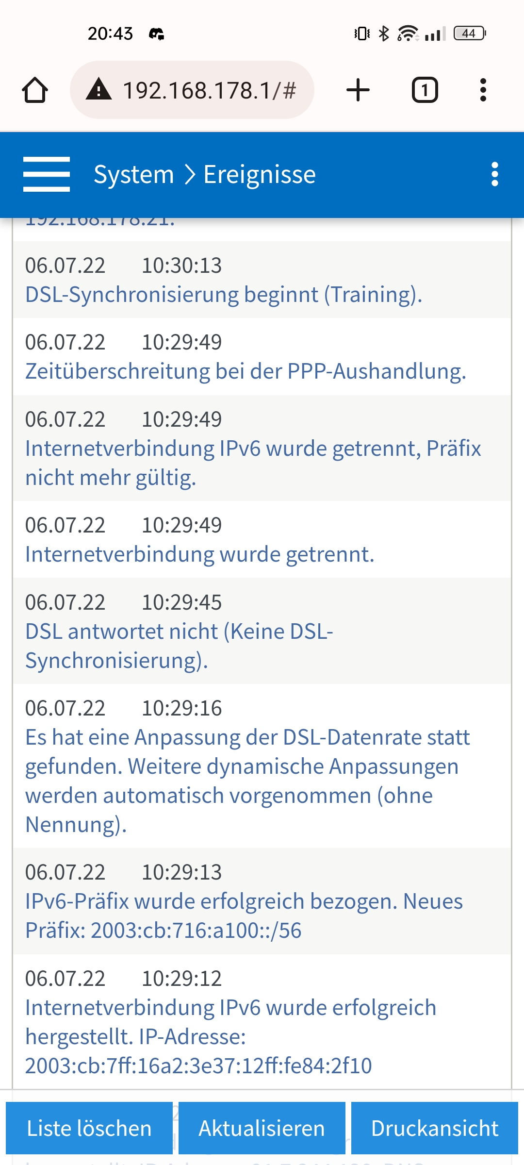 Zuerst aufgefallen ist es mir vor ein paar Tagen, als ich mit Kollegen nachts um 02:09 Uhr ein paar Runden Valorant spielen wollte. Ich bin regelmäßig rausgeflogen, obwohl der Router über die LEDs nichts angezeigt hat. Spätestens als unser iPad ebenfalls Probleme hatte, wurde ich stutzig und habe mir die Ereignisse des Routers angeguckt, dabei gab es vor ein paar Wochen schon einmal solche Probleme.