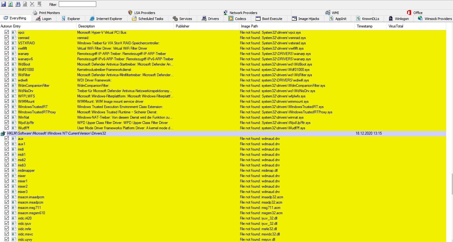 Nun habe ich nach einiger Zeit einmal wieder das Programm Autoruns verwendet und nun werden mir komischerweise sehr viele gelb unterlegte Files mit dem Hinweis "File not found" angezeigt.
