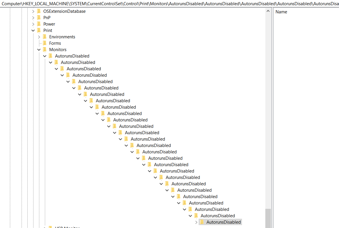 Total merkwürdig. Ist mir gerade aufgefallen, weil ich einen Eintrag zu einem nicht mehr genutzten HP-Drucker entfernen wollte (HP hinterlässt echt viel Mist). Und da ist mir dieser "AutorunsDisabled" aufgefallen mit etlichen Unterbereichen. Den untersten kann hier nicht weiter öffnen. Da erscheint dann: