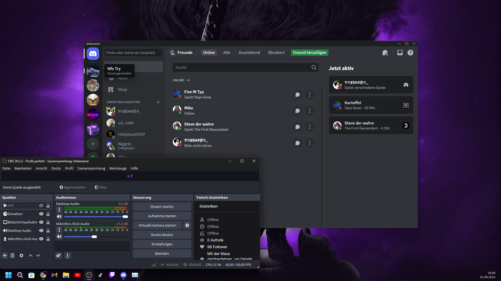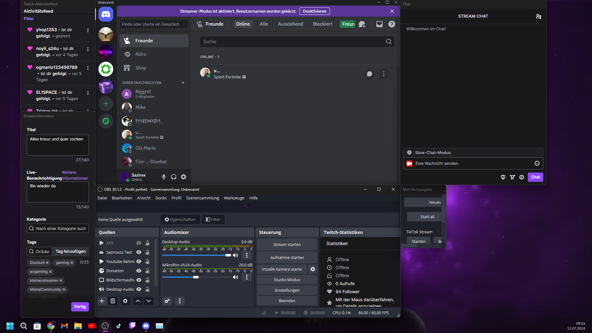 Wenn es dann nicht so aussieht wie auf dem Bild dann sind Discord (das obere Programm mittig) und OBS (das untere Programm mittig) auf dem linken Bildschirm in einer anderen Größe als die gewünschte und sie sind beide auf einem anderen Platz als sonst, dazu kommt noch das die Docks von OBS (das sind diese kleinen Fenster rings um die beiden mittleren Programme) sich an den linken Bildschirmrand auf den Hauptmonitor der links ist verabschieden.