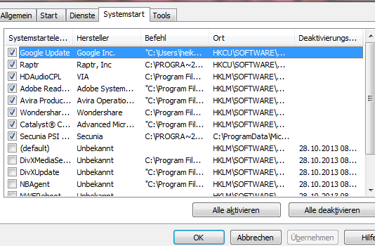 Deaktiviere doch mal alles und starte dann neu, dann siehst Du doch ob es schneller geht. Ausser Via und Catalyst würde ich es auch nicht wieder aktivieren. Am besten auch den Rest was @Adok schon sagt, deinstallieren. >> Raptr, Wondershare, Secunia PSI weg damit. die deaktivierten Tools aus 2013 würde ich auch deinstallieren wenn Du sie sowieso nicht nutzt.