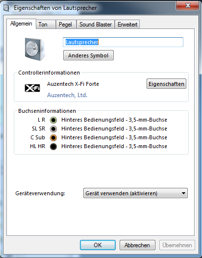 Die X-Fi Forte geht aber irgendwie von jeweils nur zweiadrigen Kabeln aus also 4 insgesamt siehe Screenshot (Front LR) (Side LR) (Rear LR) und (Sub, Center). Ist das eine neuer Standard? Gibt es dafür ein anderes Analog Multi I/O Cabel? Weil das ist etwas suboptimal bis jetzt.