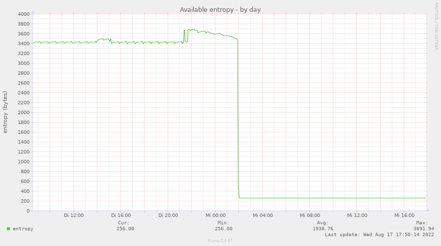 Bei mir gab es gestern ein Update des Raspberry Pi Kernels (raspberrypi-kernel Paket Version 1:1.20220811-1, Linux 5.15.56). Nach dem erforderlichen Reboot ist die verfügbare Entropie (available entropy) drastisch eingebrochen: