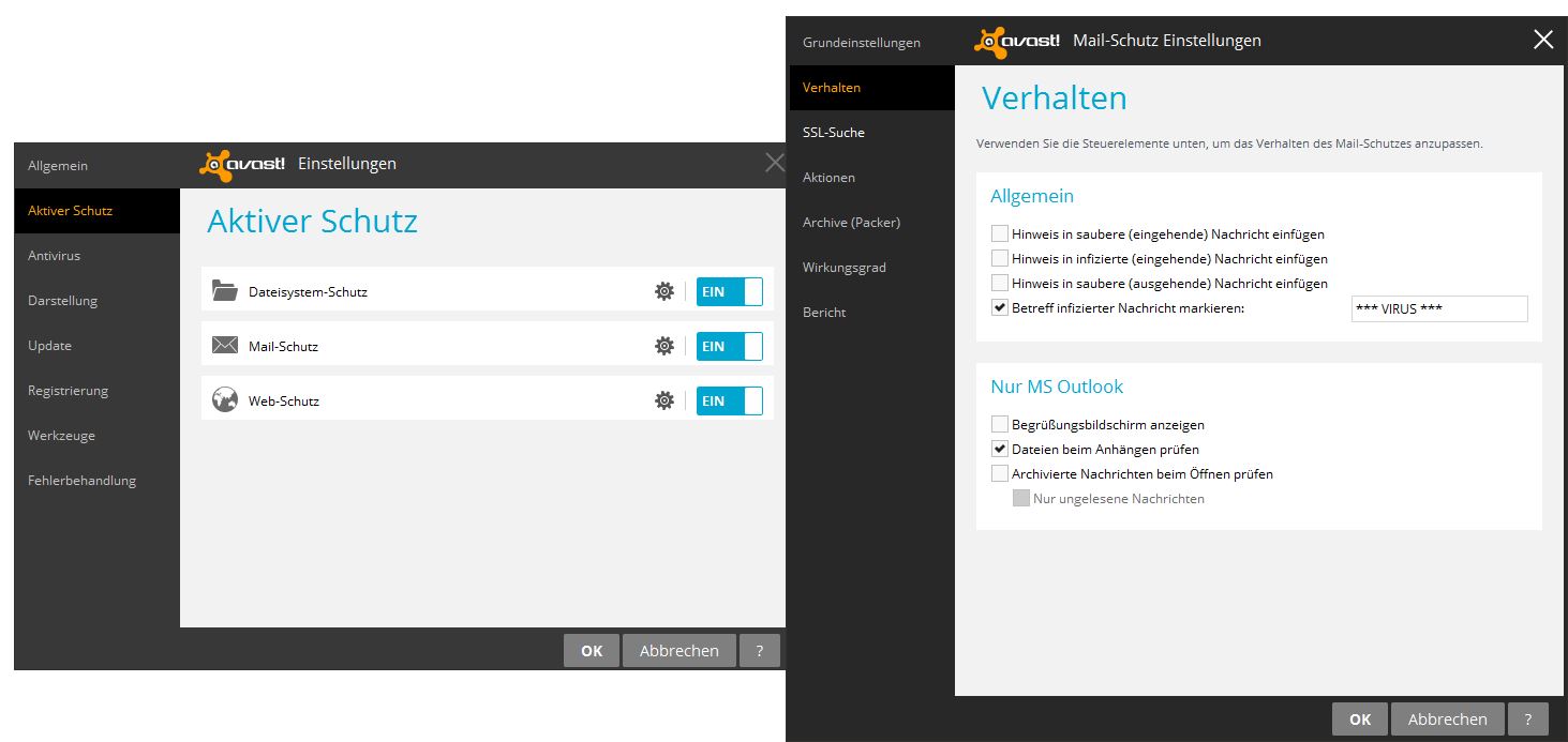 Aber sicher geht das: Einfach in den Einstellungen zunächst auf "Aktiver Schutz" links gehen. Anschließend aufs Zahnrad beim "Mail-Schutz" klicken. Danach das Feld "Verhalten" links anklicken und die Einstellungen im Verhalten bei "Allgemein" ändern: