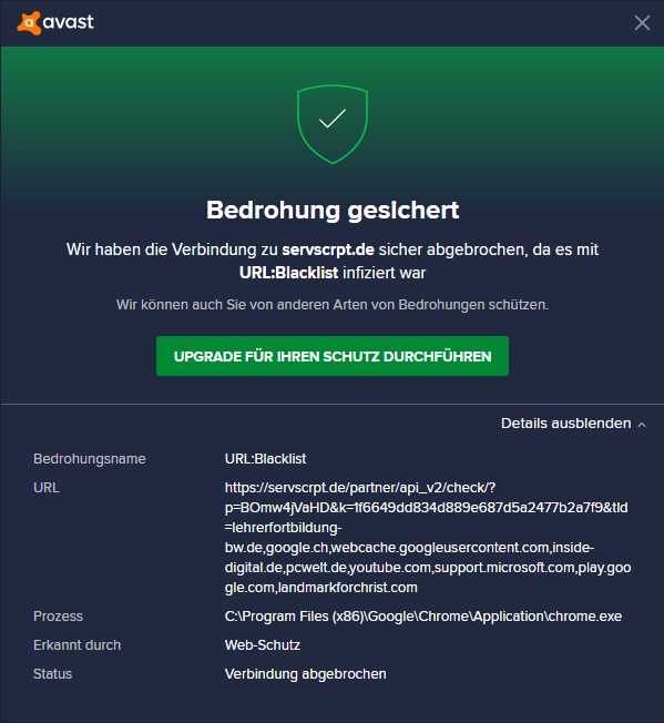 Ich habe Avast Antivirus und jedes mal, wenn ich im Browser was aufrufe, kommt die Meldung: Wir haben die Verbindung zu servscrpt.de sicher abgebrochen, da es mit URL:Blacklist infiziert war (siehe Fotos). Wisst ihr wie ich das beheben kann, evt ohne neu Installation vom Browser? Ich nutze chrome und es passiert nur mit chrome. Als Erweiterungen habe ich: