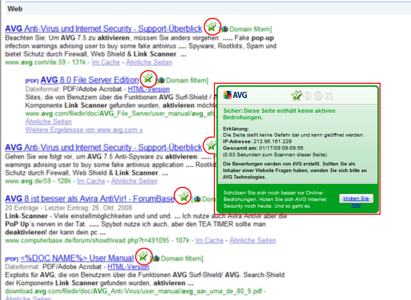 AVG bietet ja bei Google & Co. den Linkscanner an um zu signalisieren, ob ein Suchergebnis sicher ist.