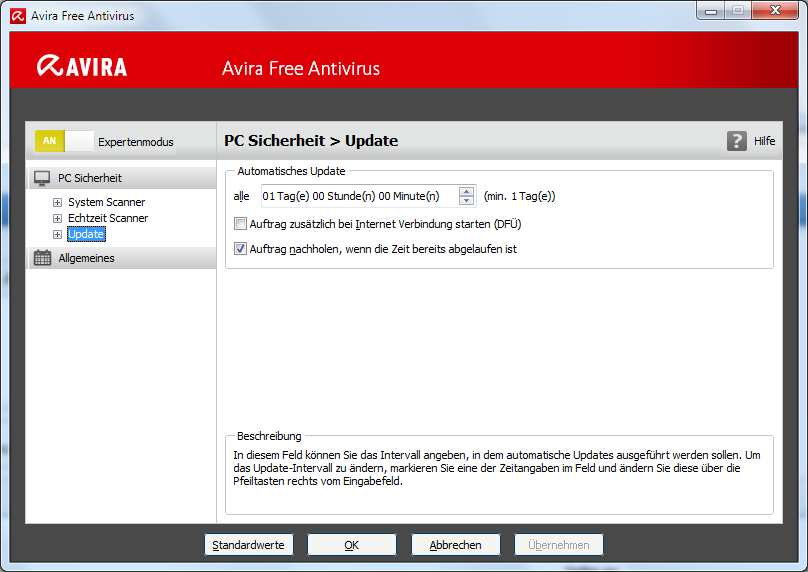 Den Planer brauchst du dafür nicht, den Eintrag kannst du entfernen. In der Konfiguration Update auf 1 Tag stellen und den Haken "Update nachholen" reinmachen. Wenn das nicht reicht, hast vielleicht eine Desktop Firewall?