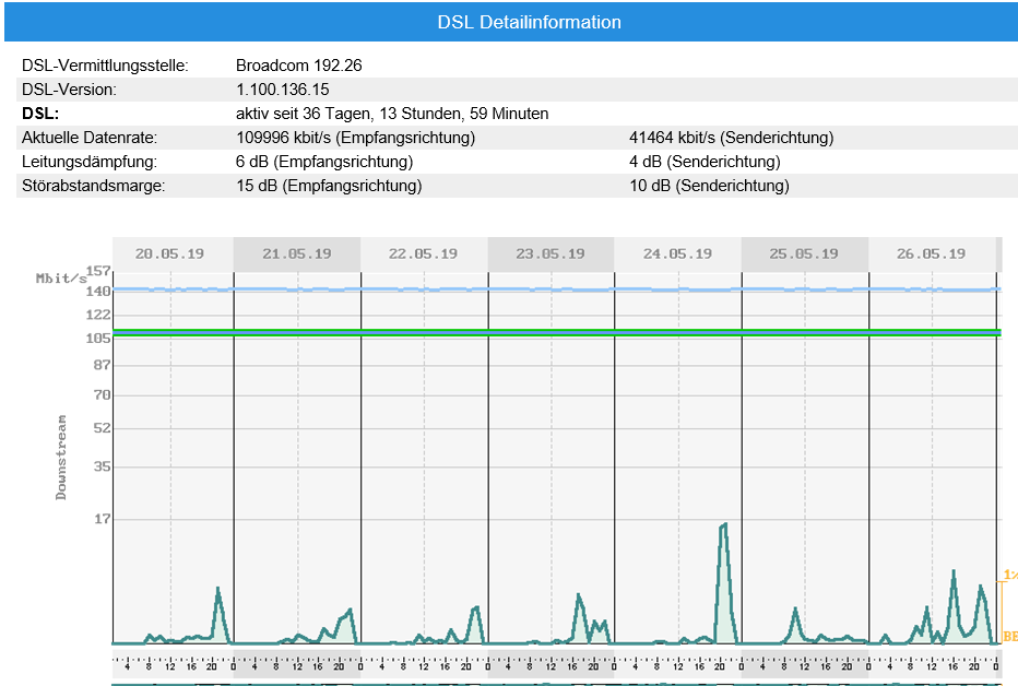 Die DSL-Datenrate (Sync) kann nun auf Wunsch auf einen Wert reduziert werden, der näher an der vertraglich zugesicherten Datenrate liegt. Dadurch wird die Empfindlichkeit der DSL Leitung gegenüber Störern reduziert.