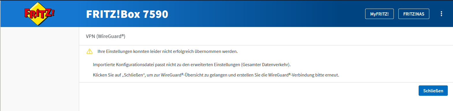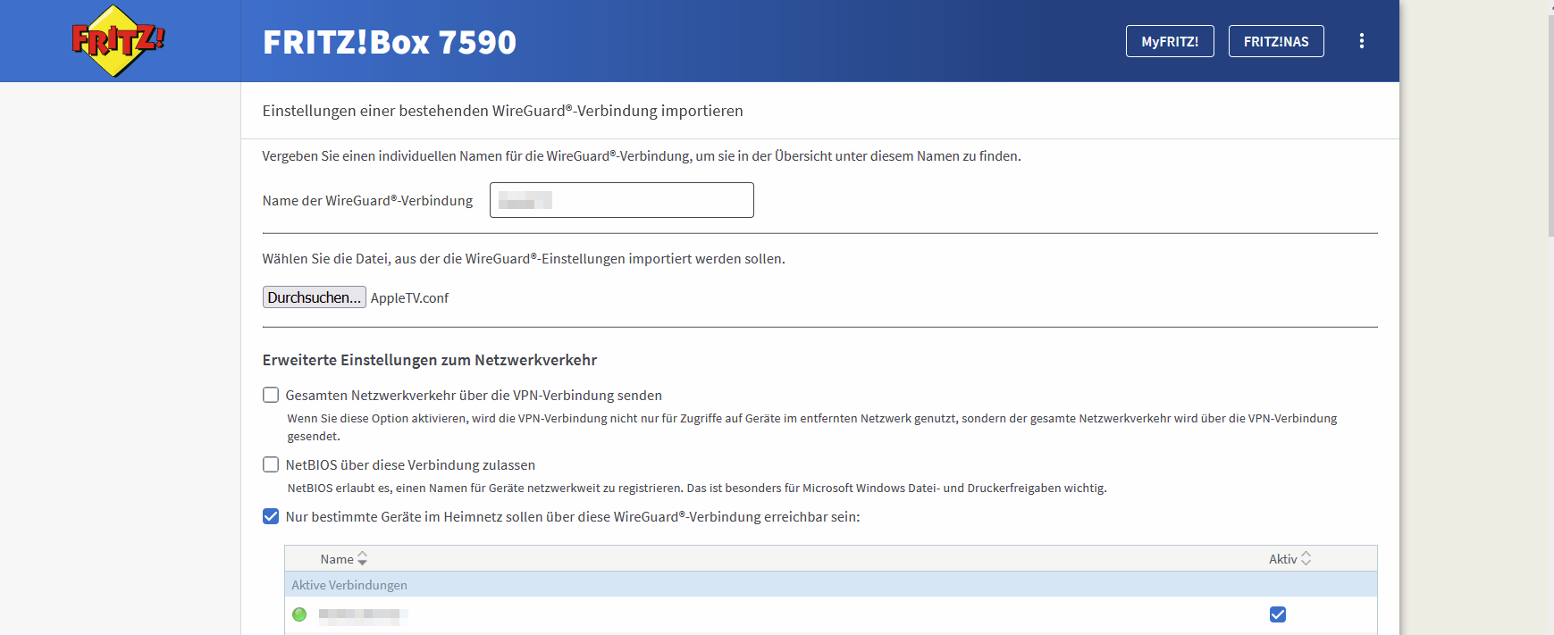 den gesamten Netzwerkverkehr über die WireGuard-Verbindung zu senden funktioniert einwandfrei. Leider funktioniert nicht die Option "Nur bestimmte Geräte im Heimnetz.....".