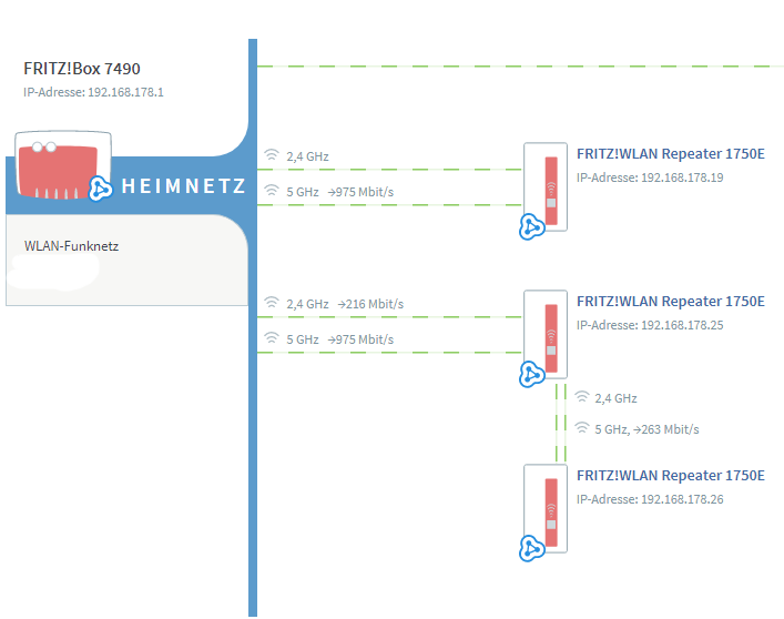 Nun soll ein großes Mesh gebaut werden - Mesh Zentrale ist eine Fritz!Box 7490.