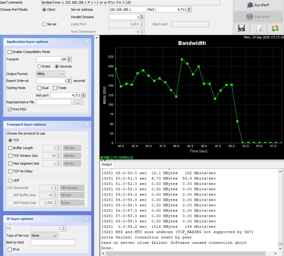 Mittels iPerf kann man den Verbindungsverlust sehr gut sehen.
